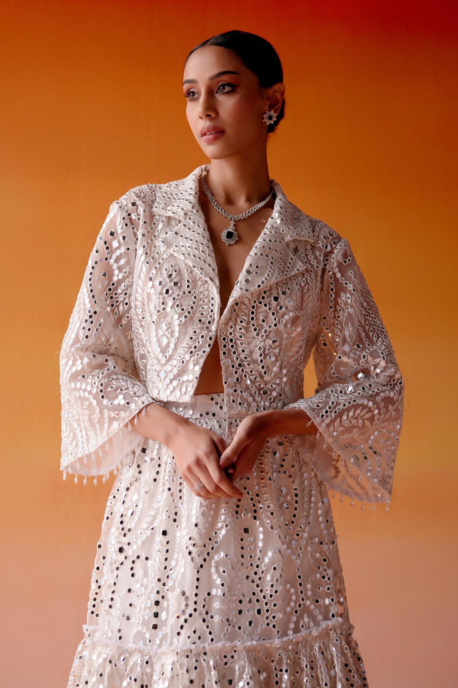 The White Mirrorwork Aaina Tier Lehenga Set by Twenty Nine is crafted for Indian wedding celebrations with a focus on elegance and structure. This Aaina tier lehenga set features layered construction enhanced with reflective mirrorwork detailing. Designed for movement and visual depth, the Aaina tier lehenga set flows gracefully while maintaining form. The white hue adds timeless sophistication, making the Aaina tier lehenga set suitable for wedding ceremonies and receptions. Styled traditionally or minimally, the Aaina tier lehenga set remains a versatile statement for modern festive wardrobes.