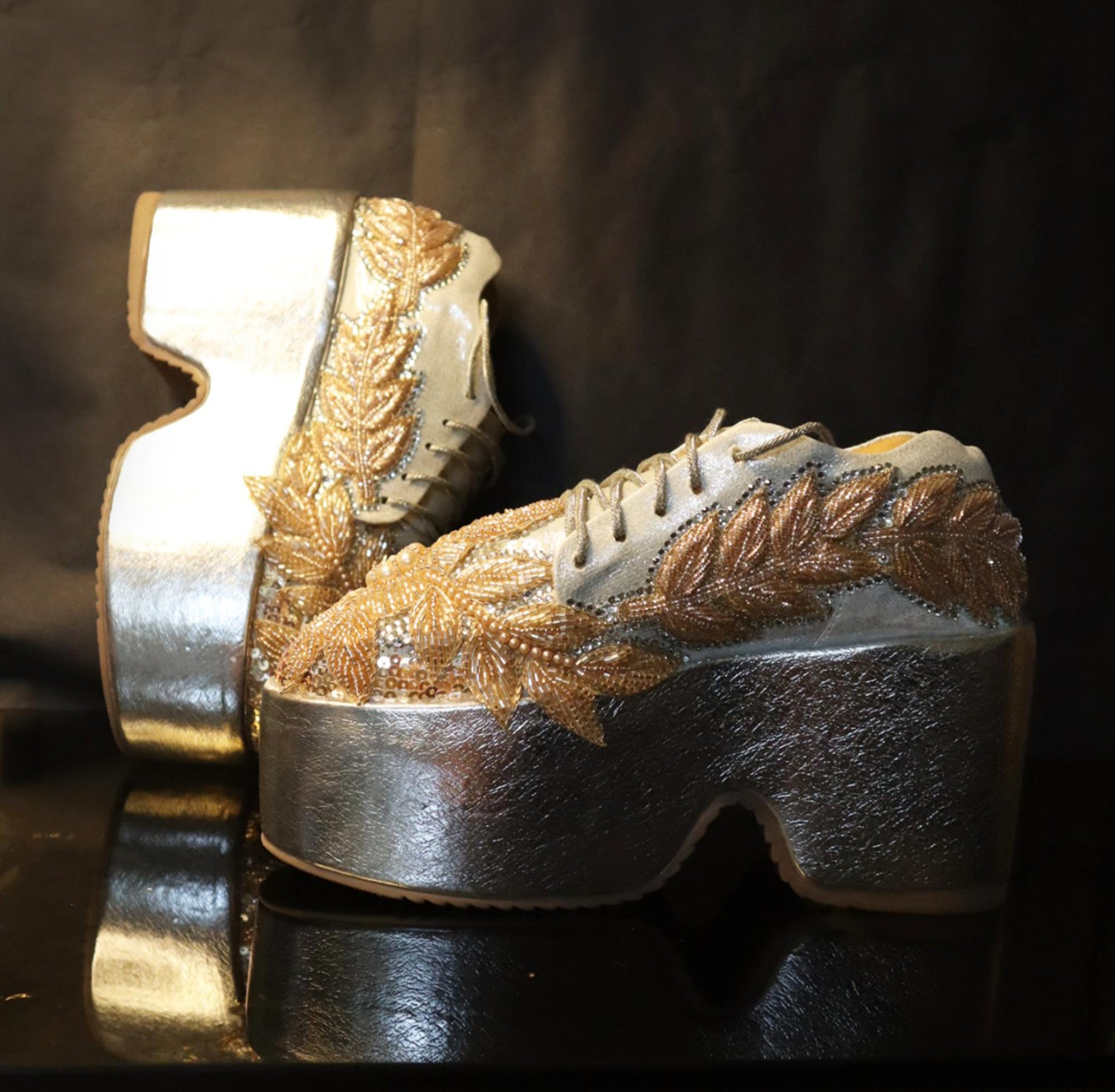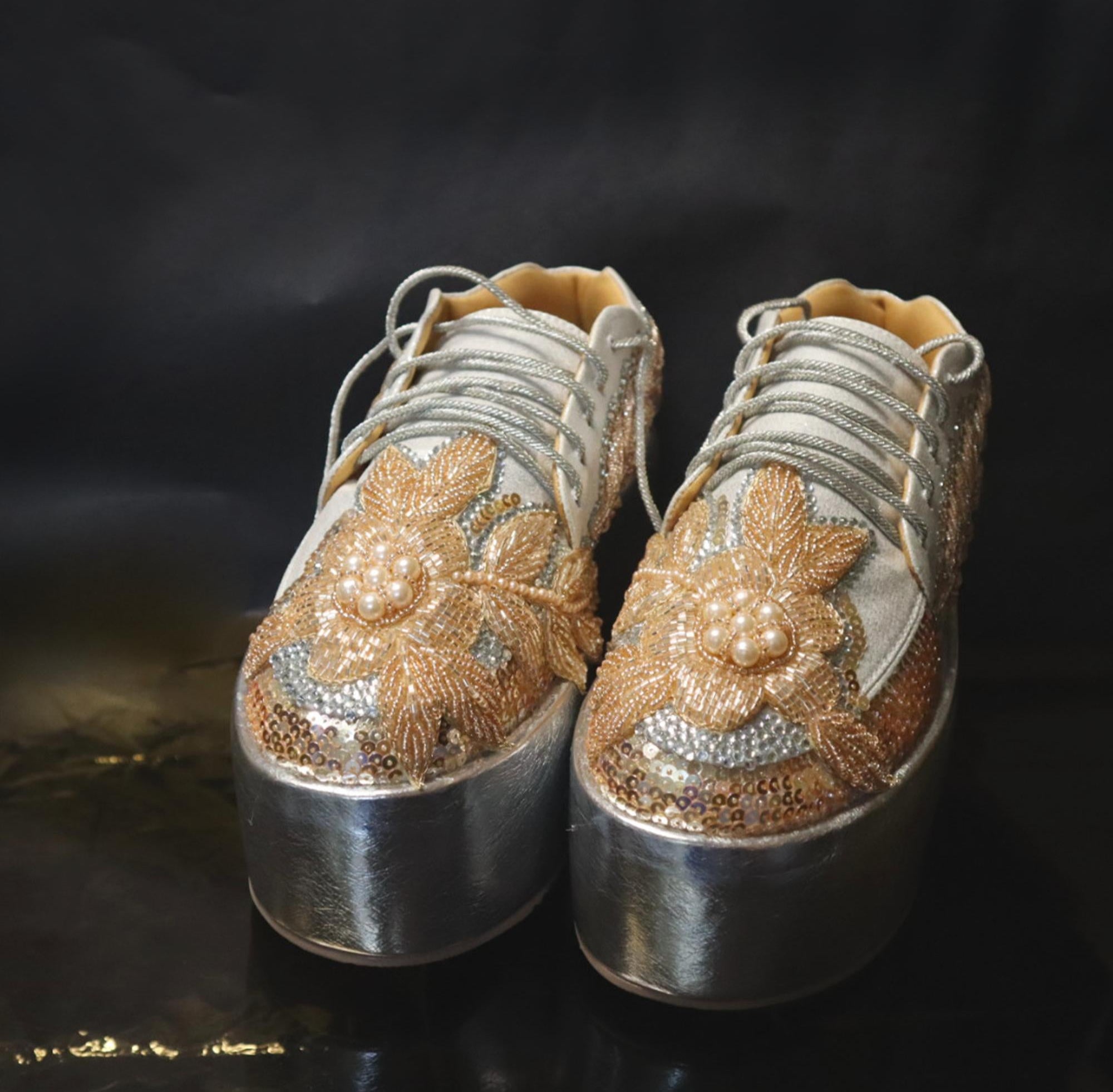 Where couture meets comfortÑthese stunning rose gold platform sneakers are designed for brides, fashionistas, and trendsetters alike. Hand-embroidered floral motifs, delicate pearl accents, and shimmering rose gold sequins create a radiant, regal glow with every step. Elevate your style effortlessly while enjoying unmatched comfort, making them the perfect statement piece for any special occasion.