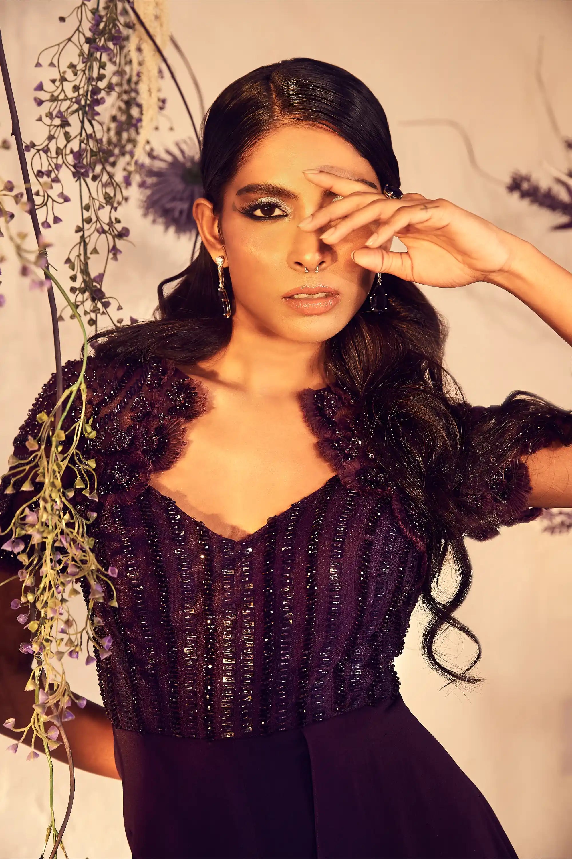 Elevate your look with this stunning ultra violet jumpsuit, featuring a beautifully embellished beaded bodice that sparkles with sophistication. The cascading silk drape adds an eye-catching element, creating movement and flair that brings the perfect oomph factor to your ensemble. Ideal for evening events or special occasions, this jumpsuit effortlessly combines glamour and modern style, ensuring you stand out with confidence and grace.