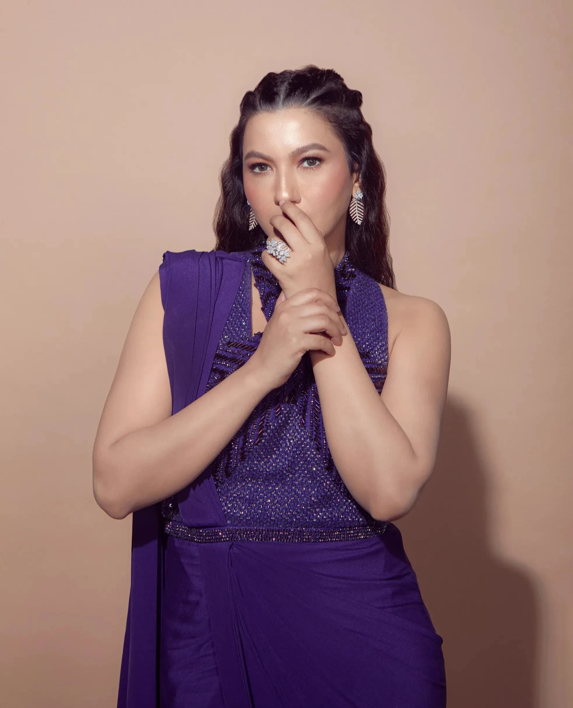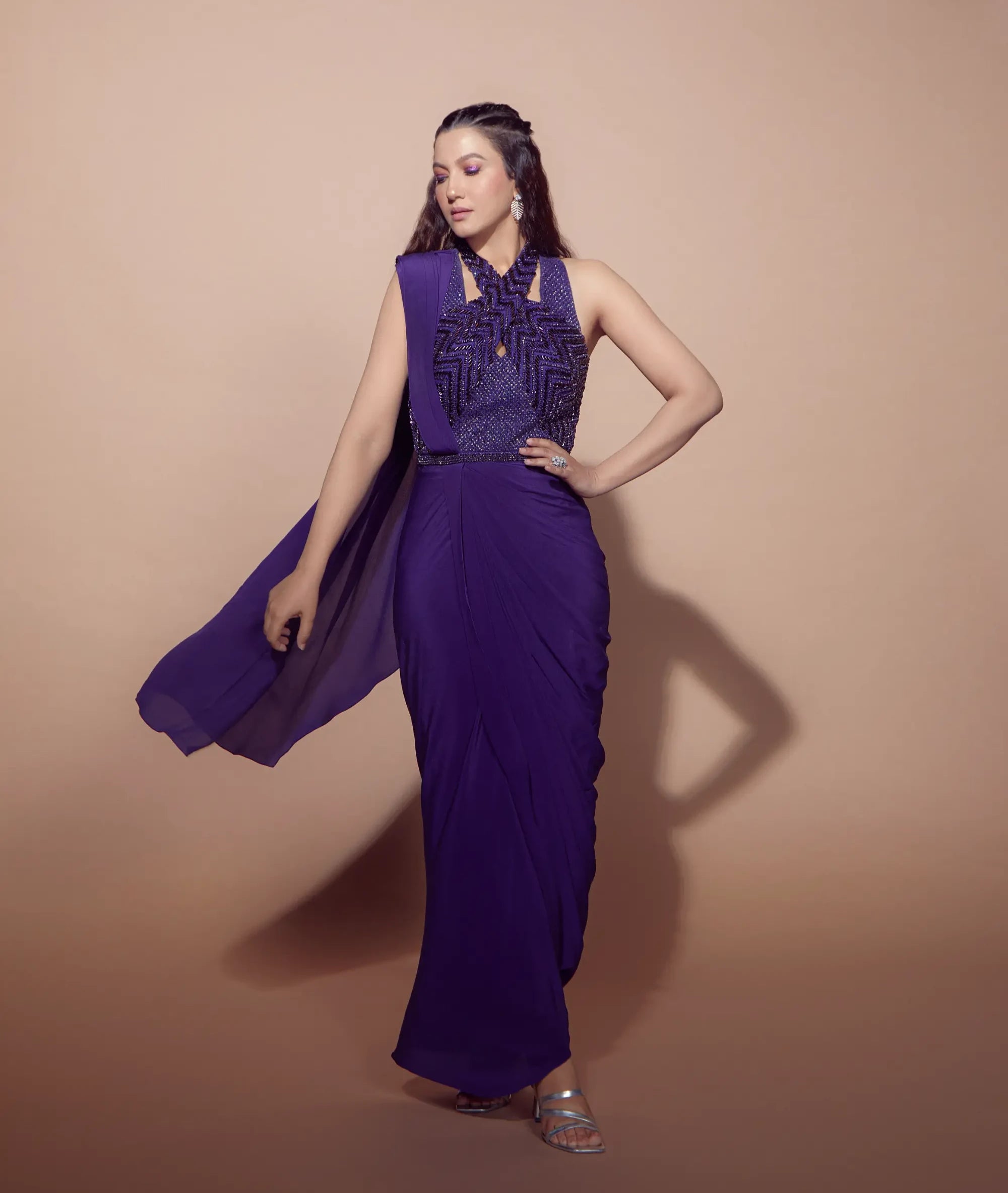 Elevate your elegance with this ultra violet pre-draped saree, featuring a distinctive drape that effortlessly combines tradition with contemporary style. The standout criss-cross plunging neckline adds a touch of allure, while the bodice is glamorously adorned with monochrome crystals, sequins, and intricate thread work. Perfect for special occasions or festive celebrations, this saree promises to make you the center of attention, showcasing a beautiful blend of sophistication and modern flair.