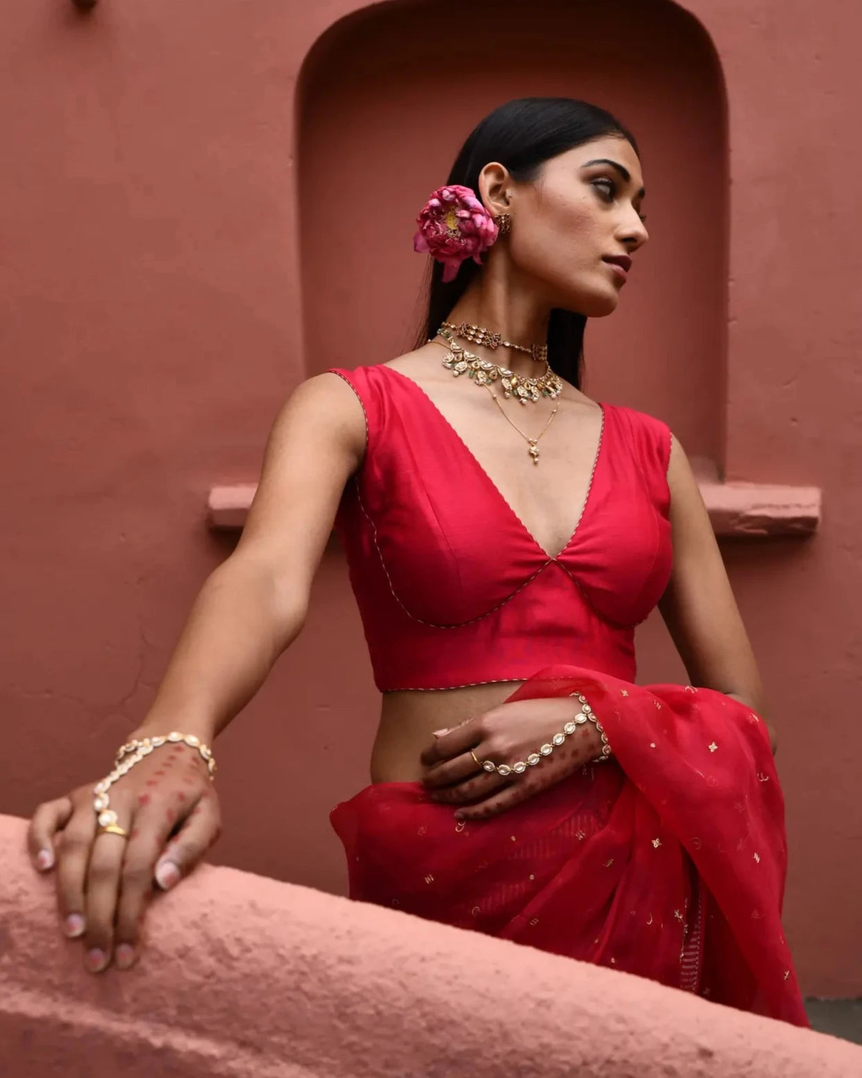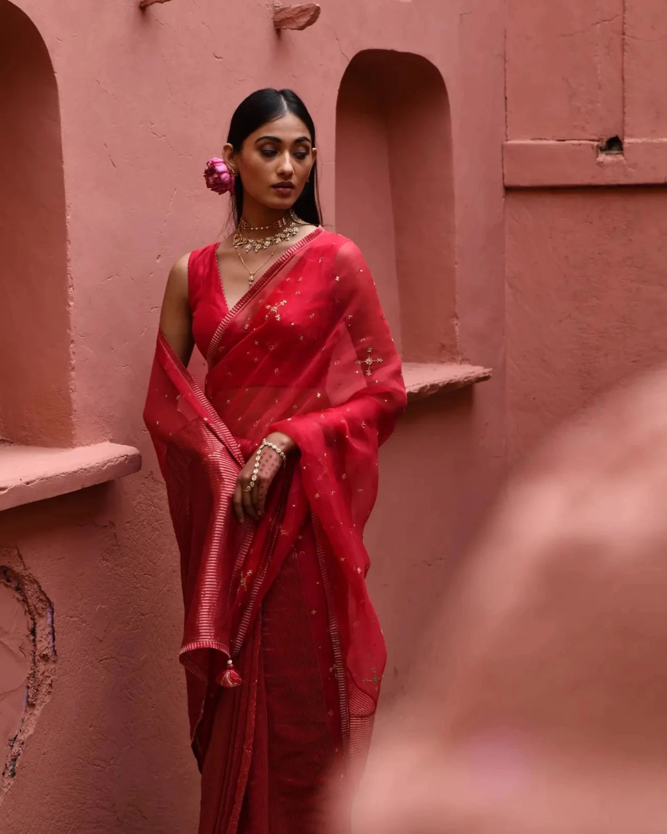 This stunning vermillion saree features exquisite nakshatra booti hand embroidery in luxurious zari and zardosi, beautifully crafted on a unique design that combines half organza and half tissue fabric. The intricate embroidery creates a captivating visual effect, making it a perfect choice for festive occasions or special events. Paired with a solid color blouse, this ensemble strikes a beautiful balance between elegance and simplicity. The lightweight fabrics drape gracefully, ensuring both comfort and style, making this saree a must-have addition to your wardrobe.