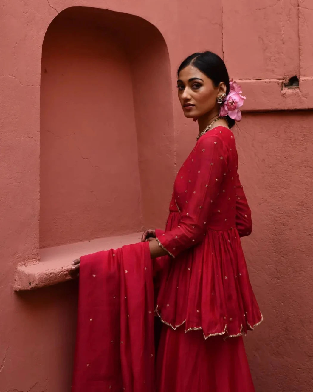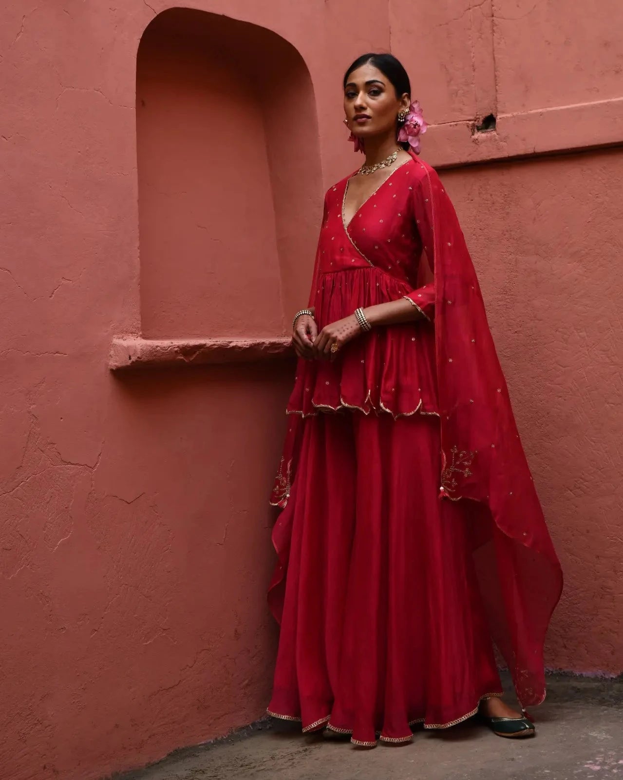 This stunning vermillion short angrakha is intricately adorned with lavish zari and zardosi phool boota embroidery, showcasing exquisite craftsmanship and a vibrant color palette. The flattering silhouette adds a modern twist to traditional attire, making it perfect for festive occasions. Paired with a flowy sharara, the ensemble offers both comfort and style. The look is beautifully complemented by a dupatta featuring kalyani booti embroidery on the corners, enhancing the overall elegance. This outfit effortlessly combines rich heritage with contemporary flair, making it a must-have for any celebration.