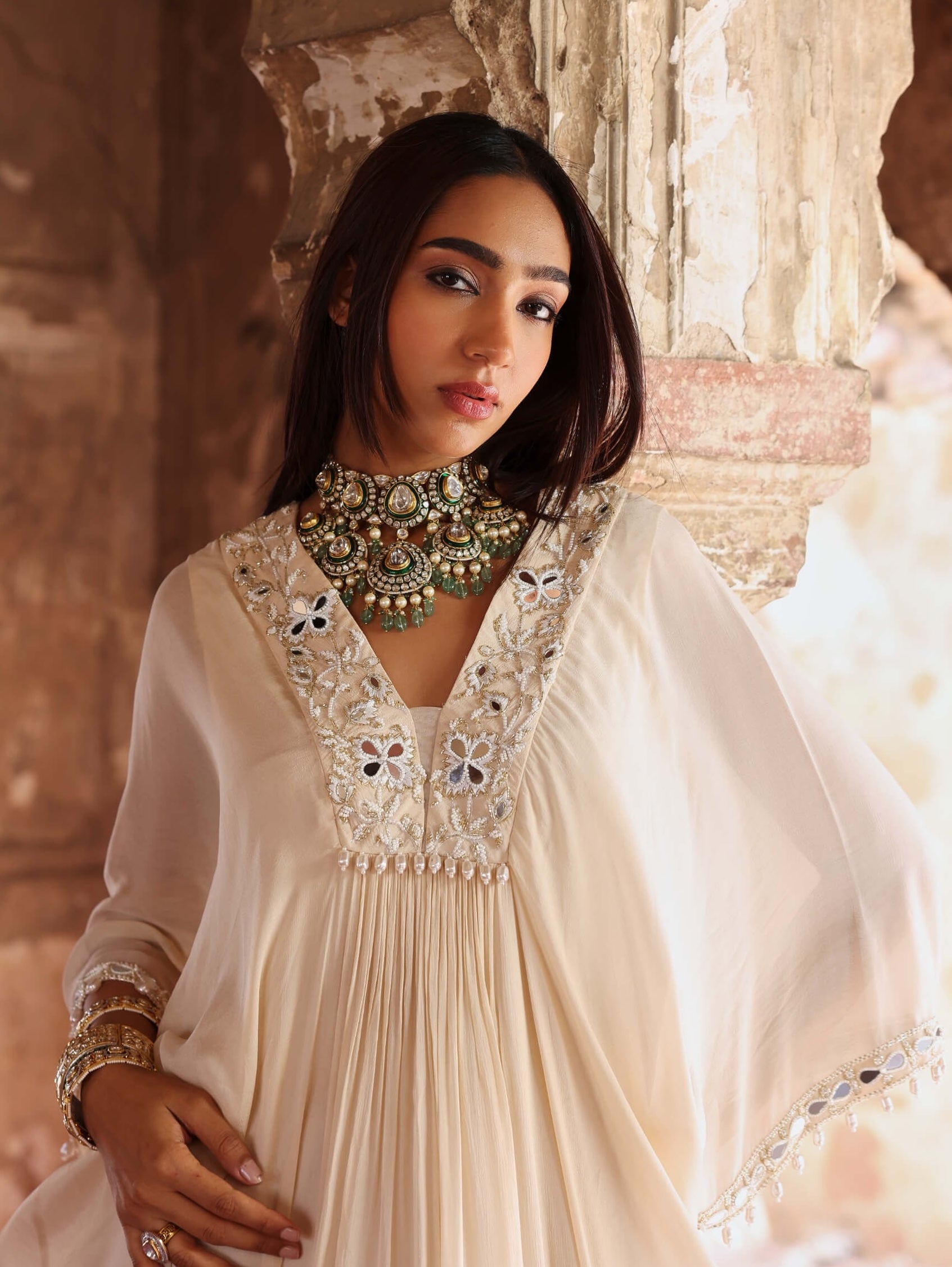 Elevate your style with the Vidhi ivory full-length draped kaftan, showcasing exquisite embellishments on the neckline and sleeves. This beautifully designed kaftan creates a sophisticated and graceful silhouette, combining comfort with refined elegance. Ideal for formal events and special occasions, its timeless ivory hue adds a classic touch that ensures you make a stunning impression. Embrace effortless sophistication and stand out with this luxurious and versatile piece.