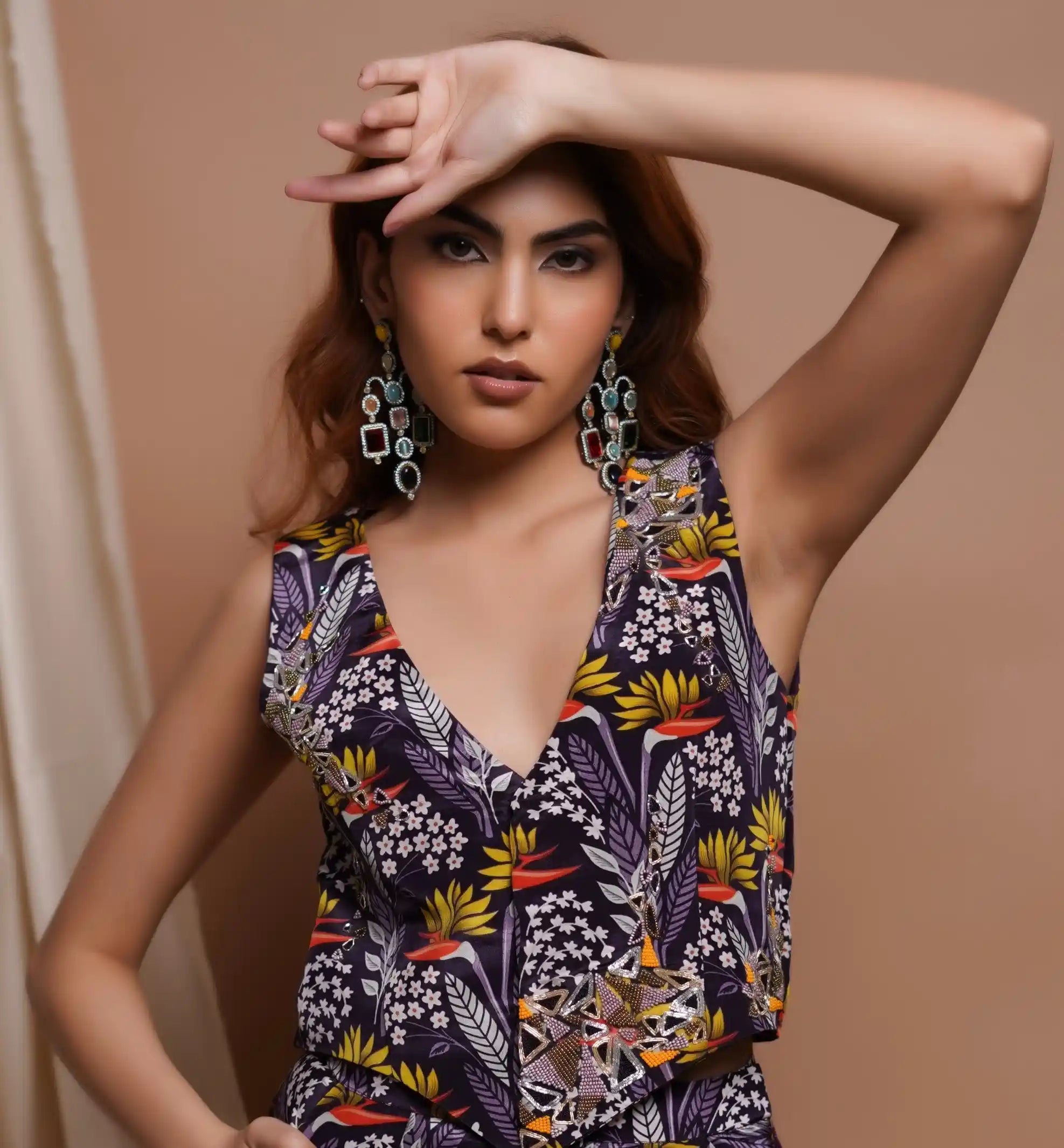 The violet print serves as a bold backdrop, enhancing the richness of the embellishments while adding a touch of vibrancy.