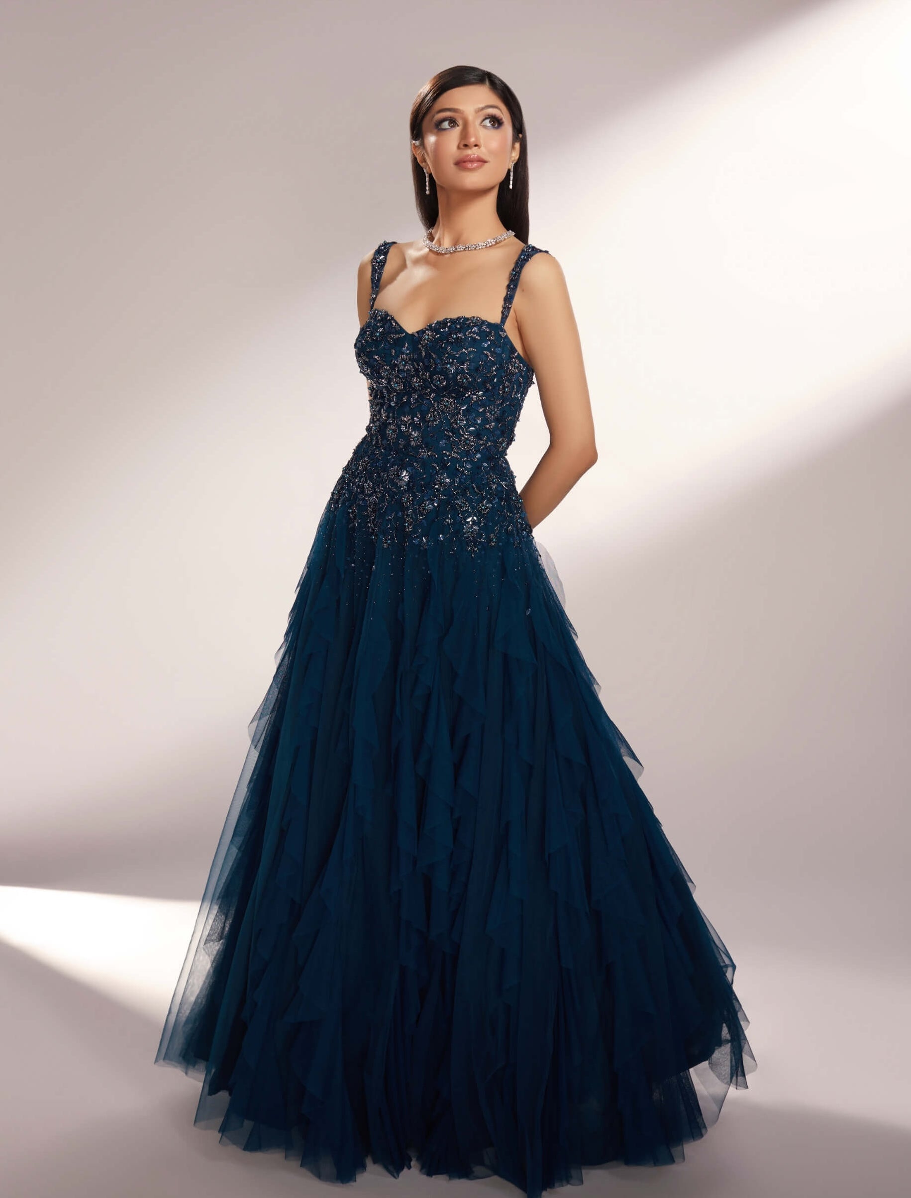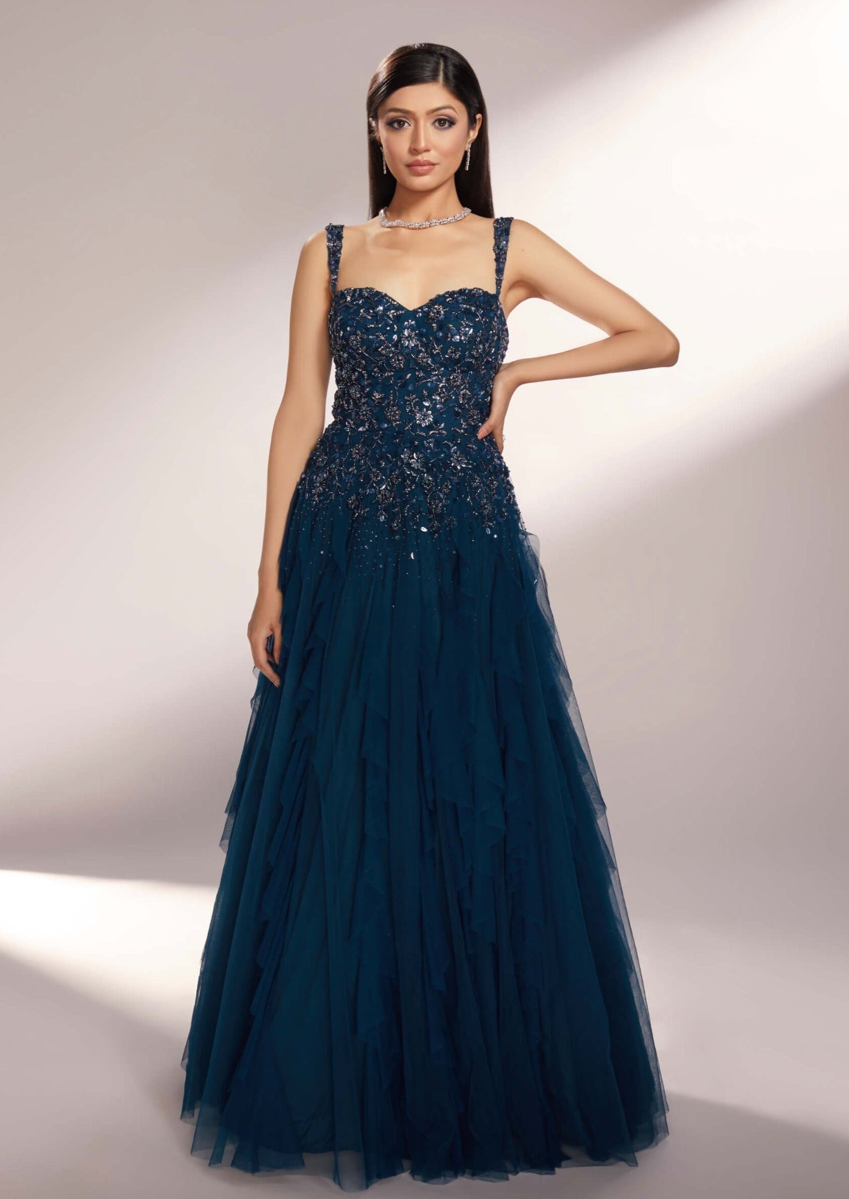 Indulge in the luxurious allure of our deep teal-toned ruffled gown a stunning showcase of contemporary elegance. The gown is adorned with delicate floral embroidery meticulously crafted with shimmering sequins glass beads and lustrous pearls creating a breathtaking play of textures and light. The cascading ruffles add a dramatic flair enhancing the gown’s graceful movement and making it a standout choice for any sophisticated affair. This ensemble effortlessly combines opulent details with modern design perfect for those who wish to make a memorable impression.