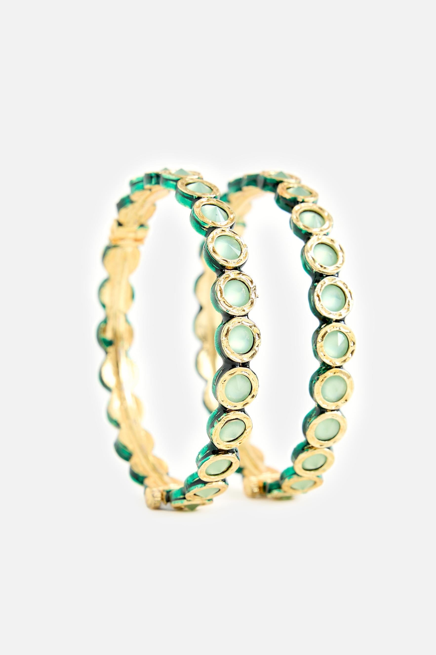The Elegant gold tone green stone rajwadi polki bangles by Vivinia by Vidhi Mehra are designed to bring effortless elegance to festive and evening styling. These polki bangles feature a refined gold-toned finish accented with pastel green stones, creating a harmonious blend of tradition and sophistication. Lightweight and comfortable, these polki bangles are ideal for long celebrations without compromising on style. Designed for versatility, the polki bangles pair seamlessly with ethnic ensembles such as sarees, lehengas, and anarkalis, while also complementing modern outfits for cocktail evenings. The rajwadi inspiration adds heritage charm, making these polki bangles suitable for weddings, festive occasions, and celebratory gatherings. Whether styled as a statement accessory or layered with other jewellery, these polki bangles elevate any look with subtle glamour. Crafted for women who appreciate elegance and adaptability, these polki bangles are a timeless addition to any jewellery collection.