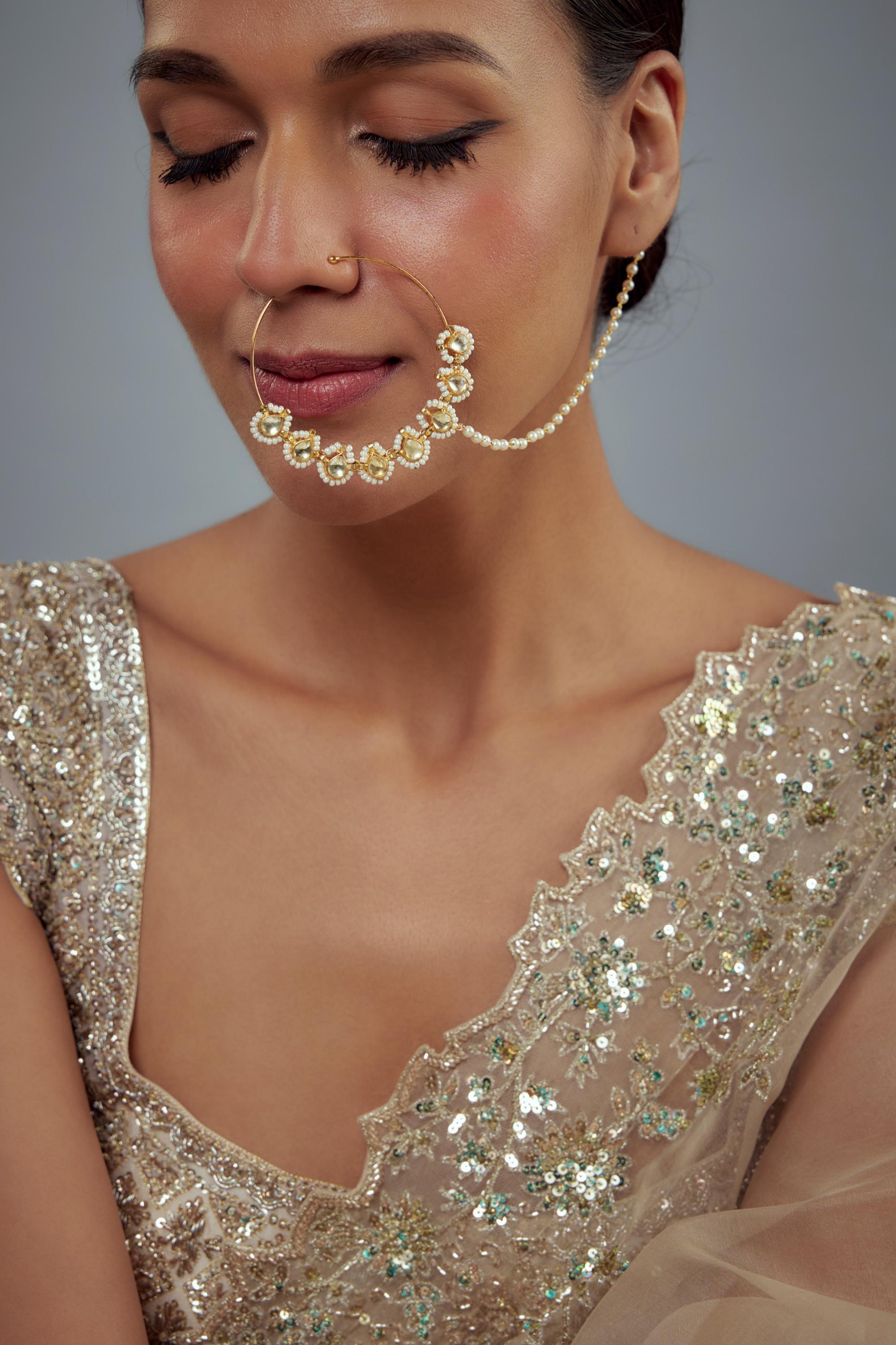 The Gold Saadgi Nath with Chain from Vivinia by Vidhi Mehra is a timeless accessory that embodies festive elegance and refined craftsmanship. Featuring a polished gold finish with intricate detailing, this nath adds a regal and graceful touch to any ensemble. Perfect for weddings, festivals, and special occasions, it pairs beautifully with lehengas, sarees, and designer gowns. Designed for both comfort and style, the Gold Saadgi Nath with Chain reflects meticulous artistry, making it a luxurious addition to your jewelry collection. Its intricate design, polished finish, and sophisticated aesthetic make it a standout accessory, elevating your festive look with charm, elegance, and tradition, while ensuring it remains a treasured piece for years to come.
