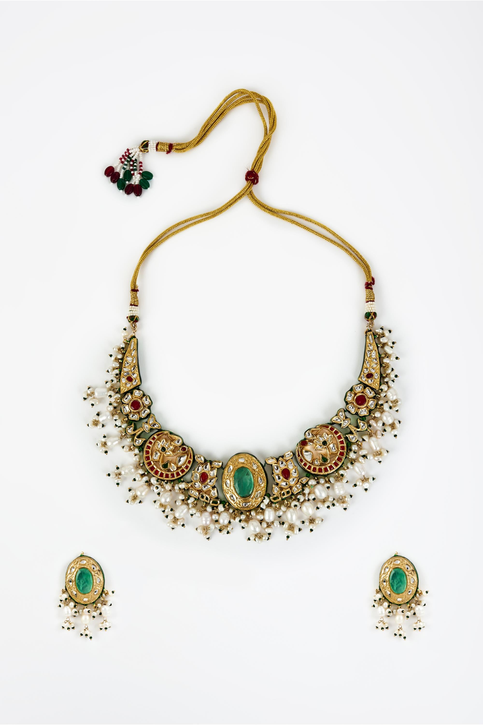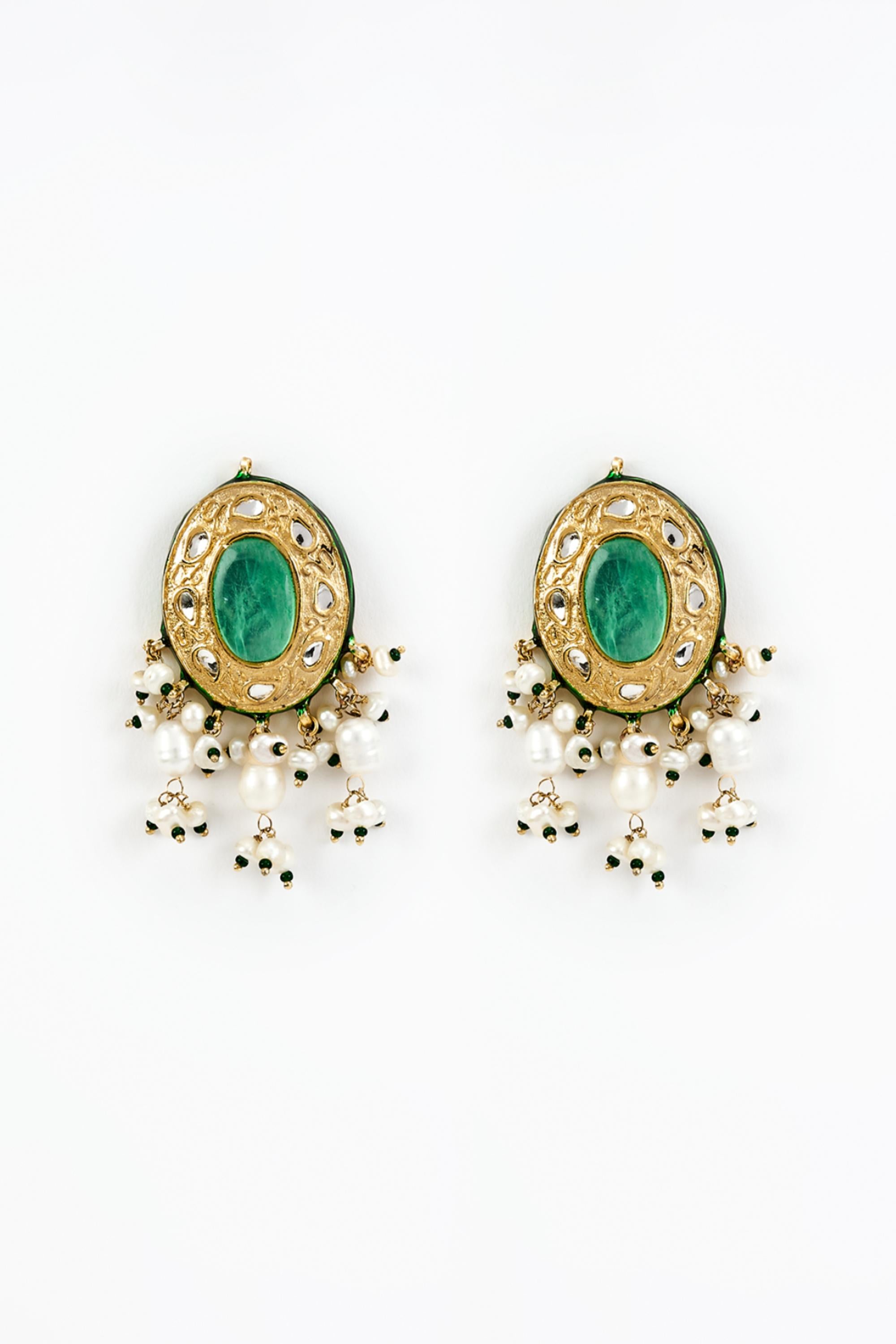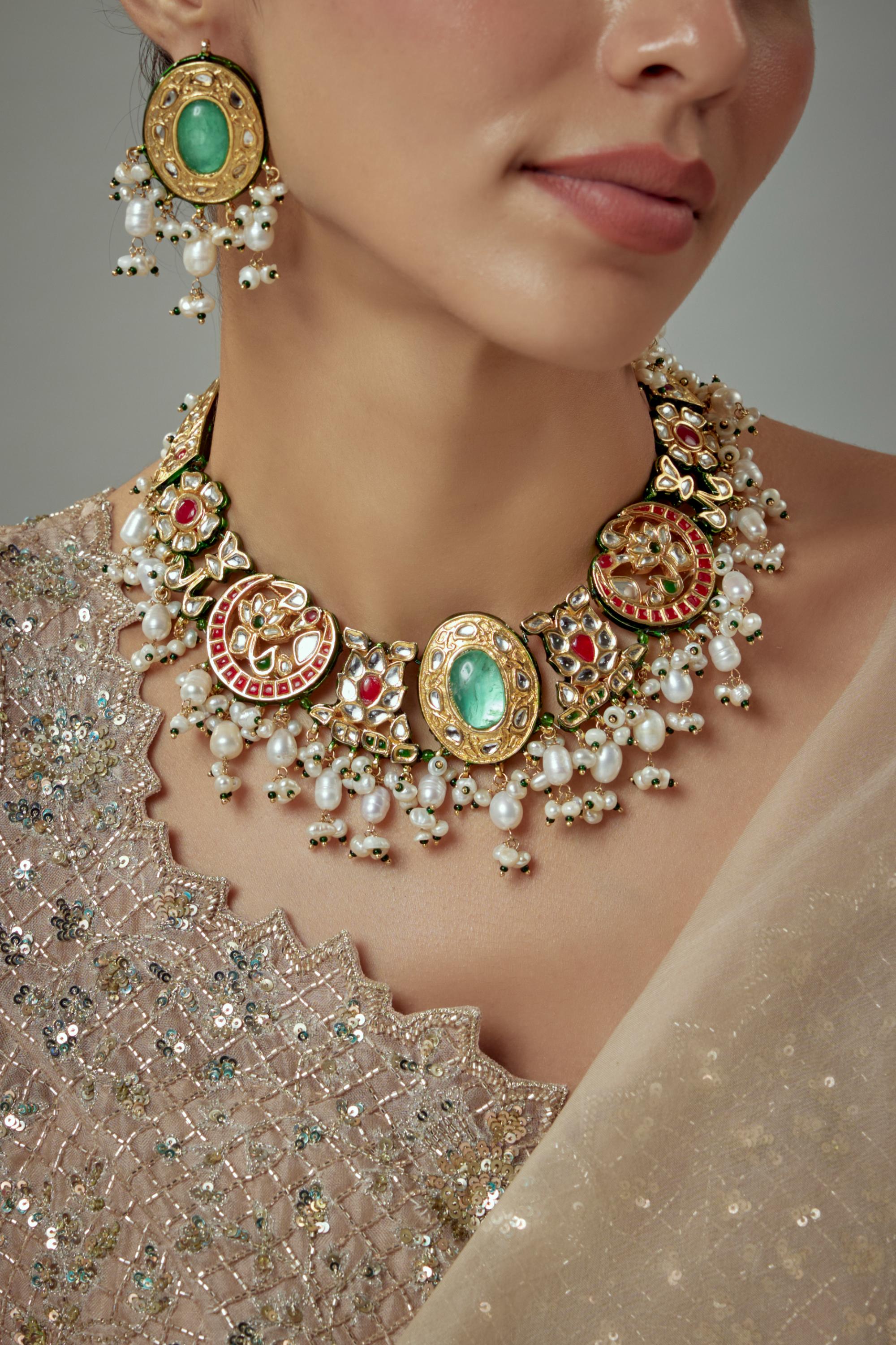 The Green Saadgi Choker Set from Vivinia by Vidhi Mehra is a perfect blend of festive elegance and refined craftsmanship. Featuring a vibrant green design with intricate detailing, this choker set adds a regal touch to any ensemble. Ideal for weddings, festivals, and special occasions, the set complements lehengas, sarees, and designer gowns with sophistication. Designed for comfort and style, the Green Saadgi Choker Set reflects meticulous artistry and timeless design, ensuring a luxurious addition to your jewelry collection. Its intricate work and vibrant color make it a standout accessory, elevating your festive look with grace, charm, and elegance. Bring home this exquisite choker set for a truly statement-making festive appearance.