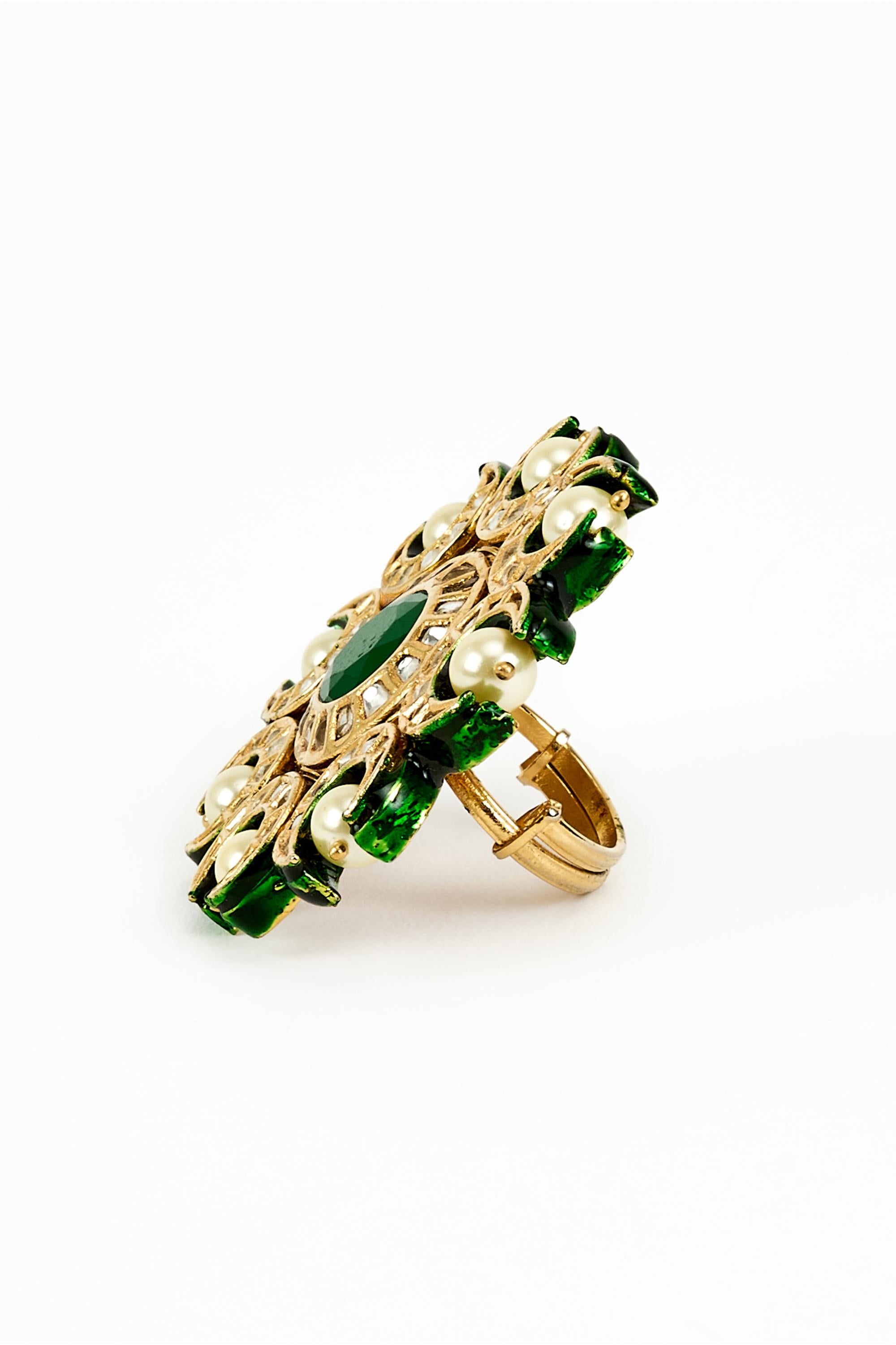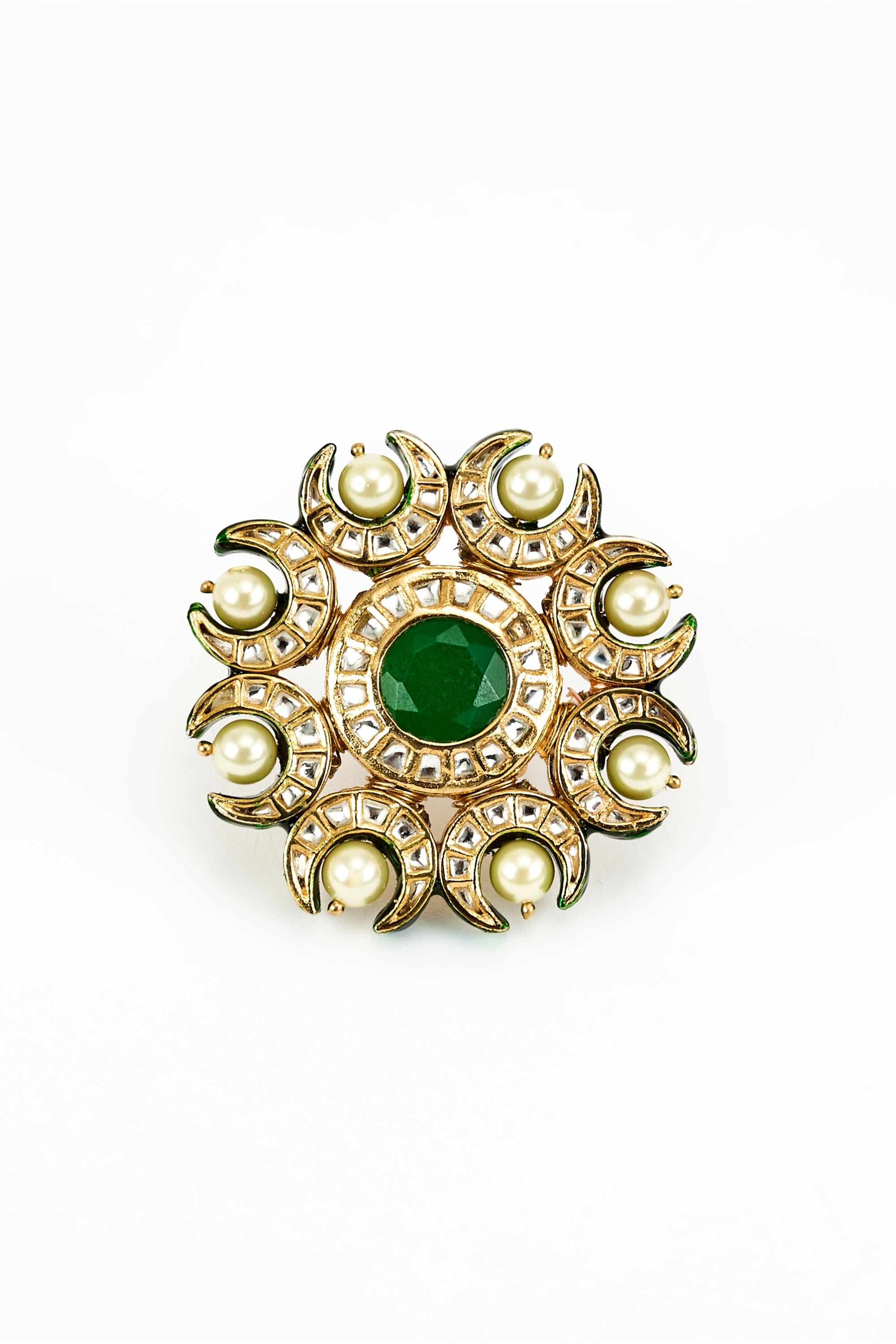 The Green Saadgi Ring from Vivinia by Vidhi Mehra is a striking accessory that combines festive elegance with refined craftsmanship. Featuring a polished gold finish adorned with vibrant green accents, this ring adds a touch of sophistication and color to any ensemble. Perfect for weddings, festivals, and special occasions, it pairs beautifully with lehengas, sarees, and designer gowns. Designed for both comfort and style, the Green Saadgi Ring reflects meticulous artistry, making it a luxurious addition to your jewelry collection. Its vibrant green detailing, timeless design, and polished finish make it a standout accessory, enhancing your festive look with charm, elegance, and grace while ensuring it remains a cherished piece for years to come.