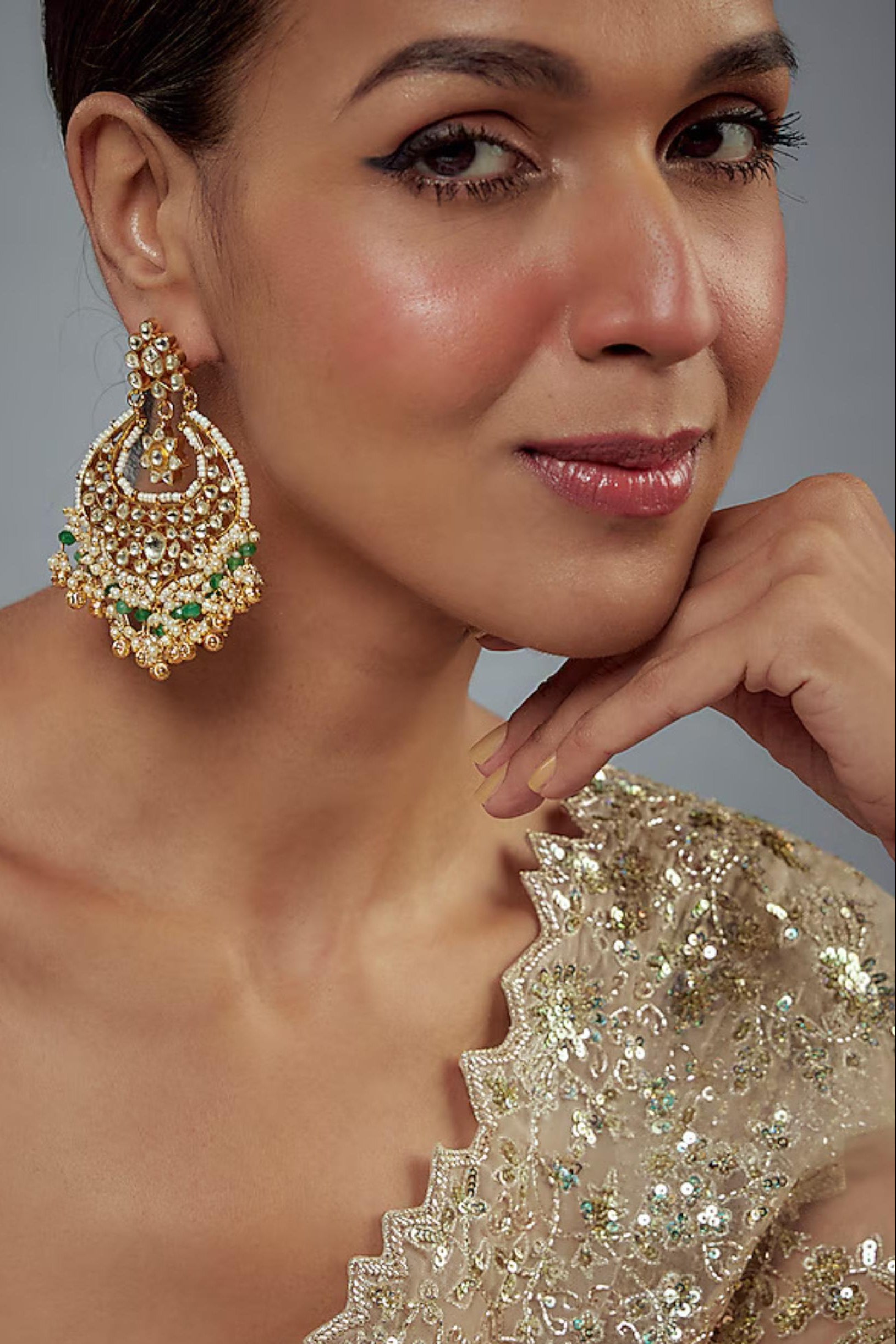 These Green Saadgi Kundan Dangler Earrings balance traditional kundan detailing with refreshing green tones. Their timeless design makes them ideal for haldi, mehendi, or wedding festivities. Lightweight yet statement-worthy, they add richness and elegance.