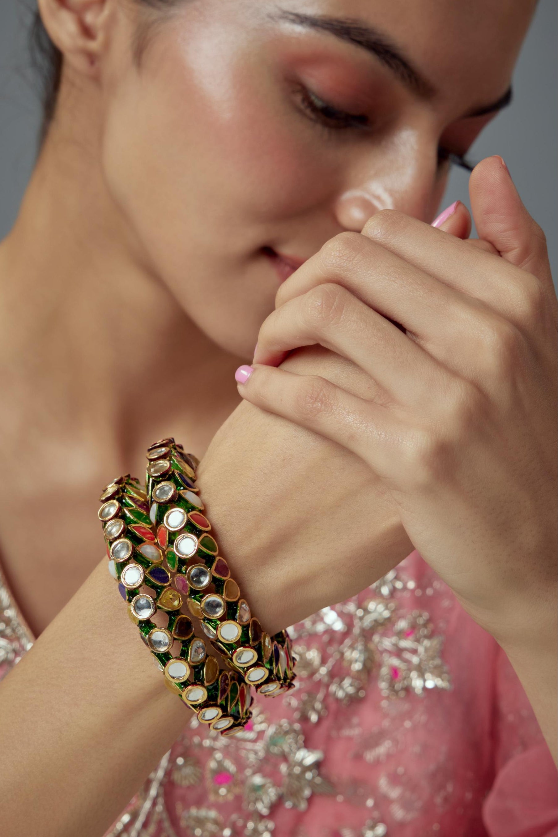 The Multicolor Saadgi Kundan Bangles are festive, vibrant, and perfect for stacking with lehengas or sarees. Their multicolored kundan work brings a joyful sparkle ideal for haldi, mehendi, or family celebrations.