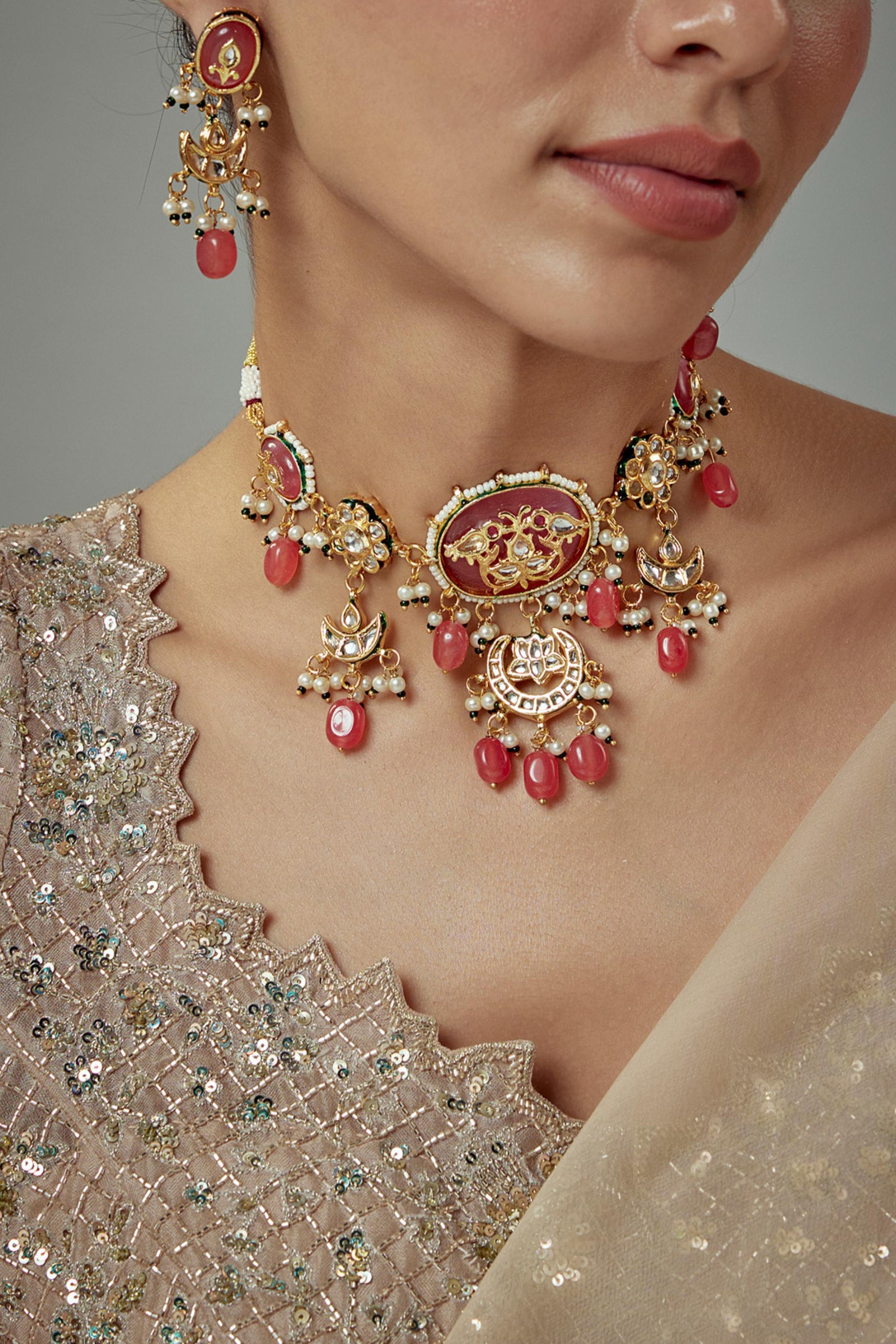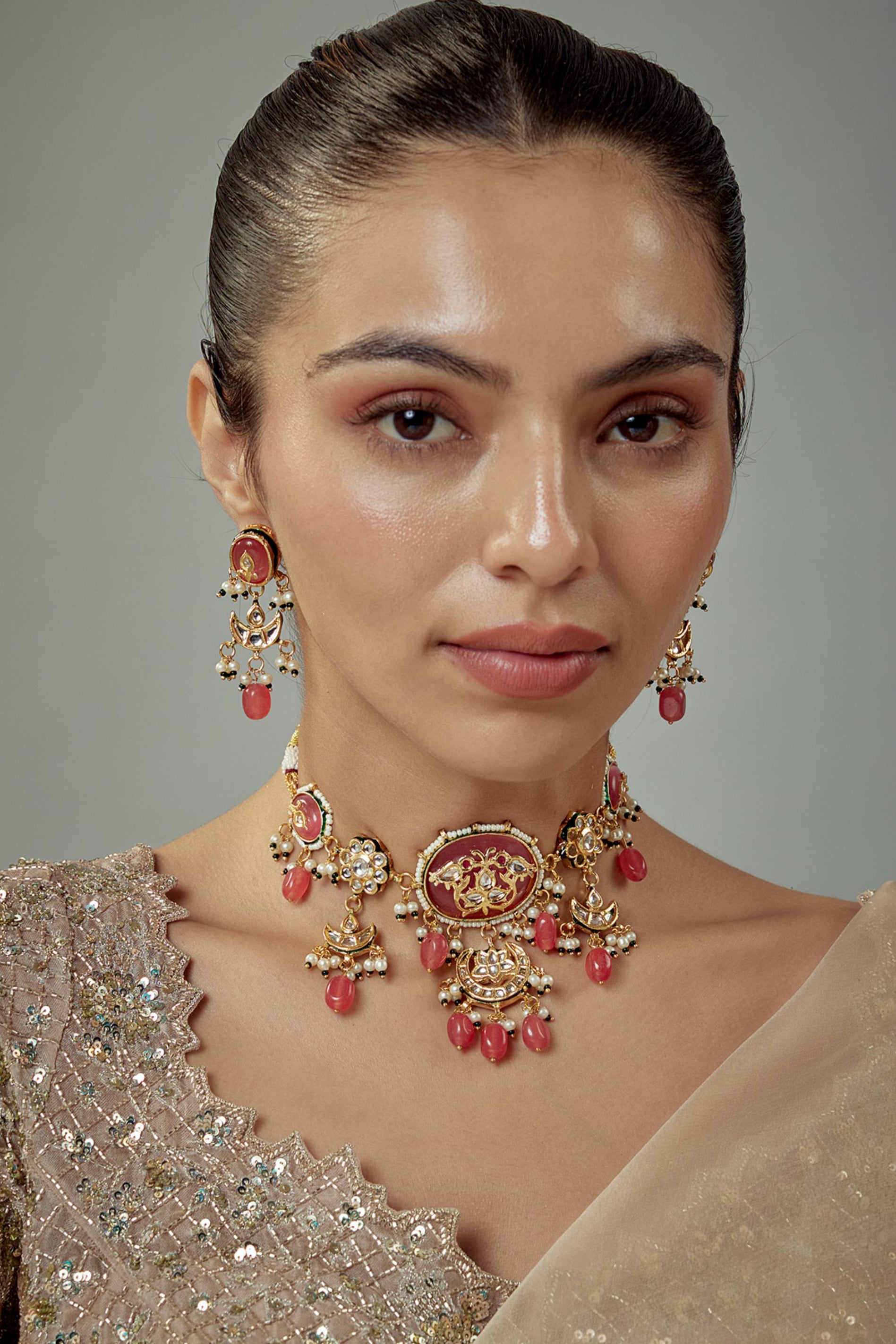 The Pink Saadgi Choker Necklace Set exudes soft romance and feminine charm. Ideal for bridesmaids, sisters of the bride, or pastel-themed ceremonies, its delicate tones elevate festive looks beautifully. Pair it with chiffon sarees, lehengas, or shararas to create a cohesive and elegant statement. Its lightweight feel makes it perfect for day-to-night celebrations.