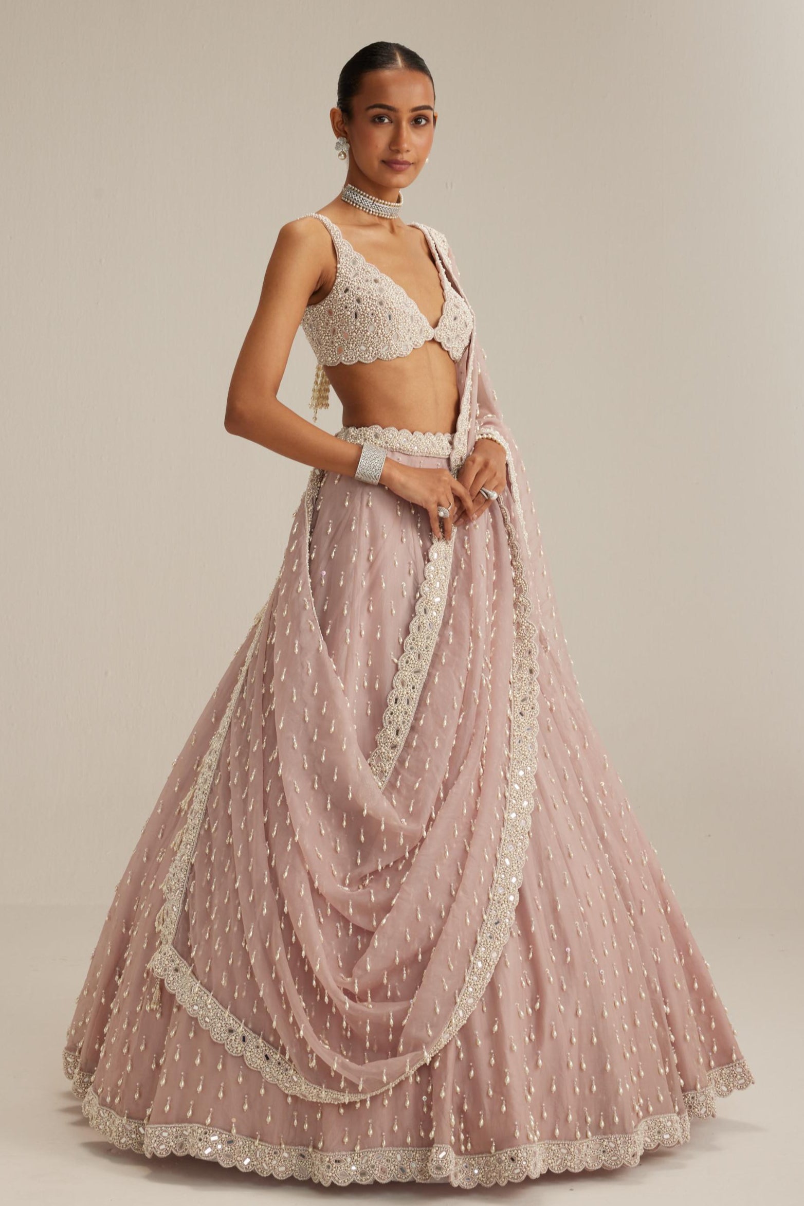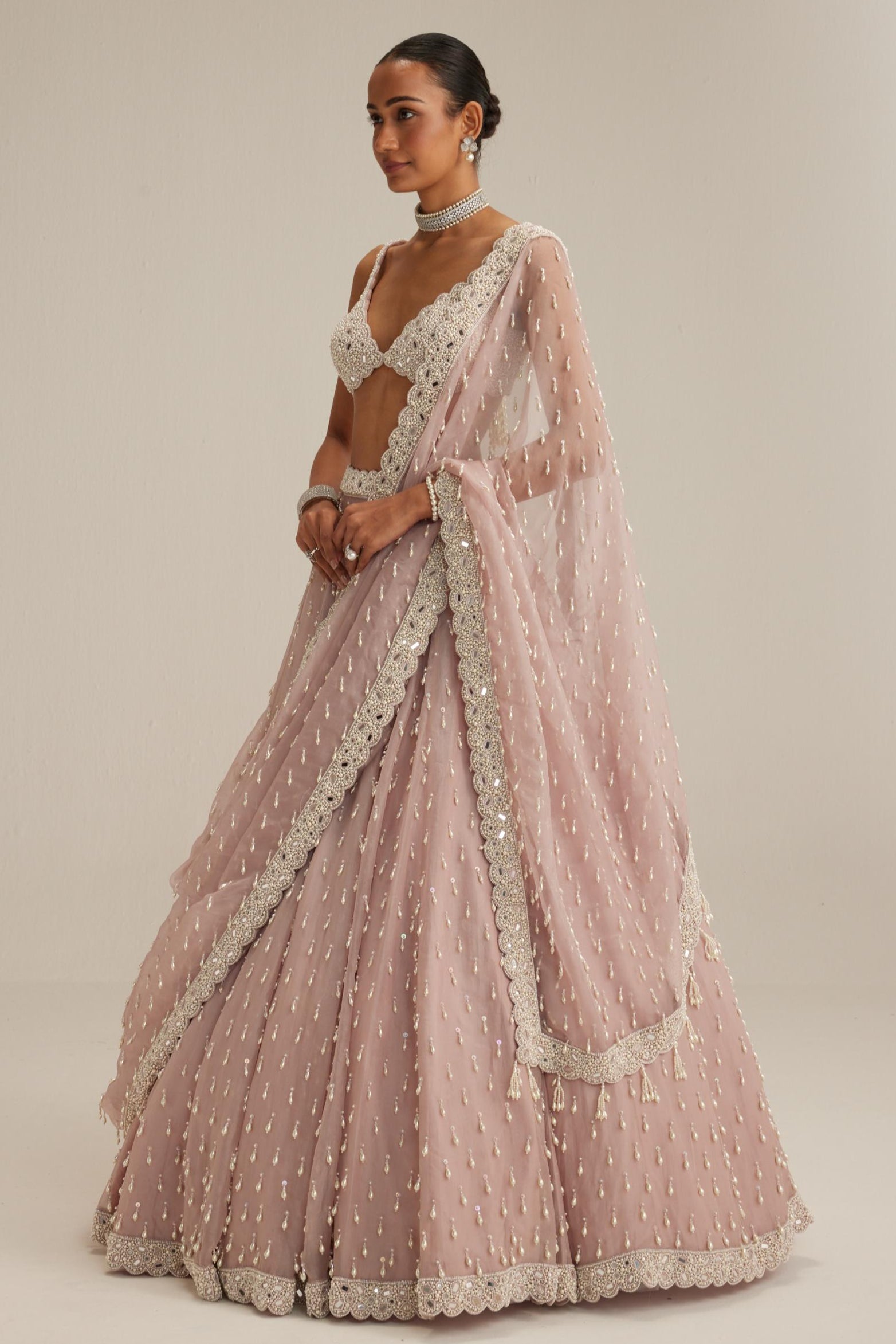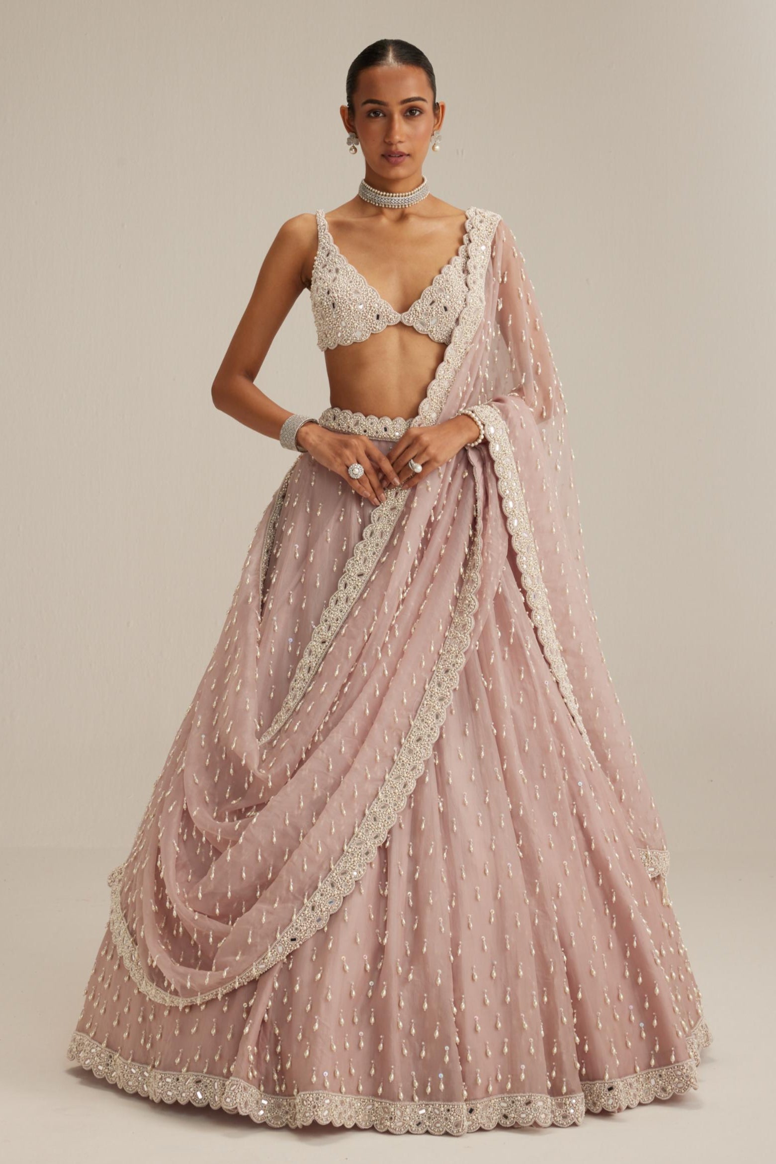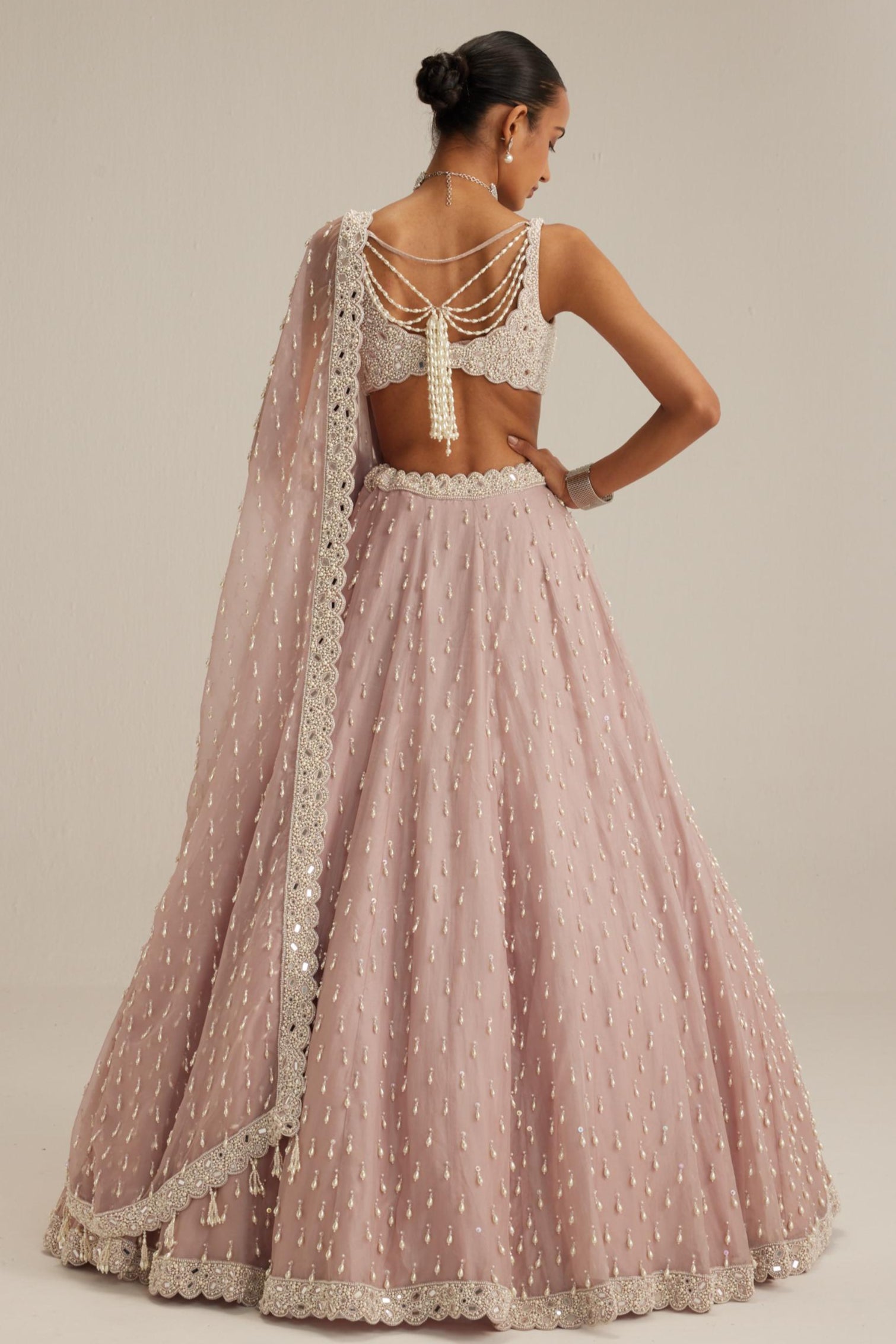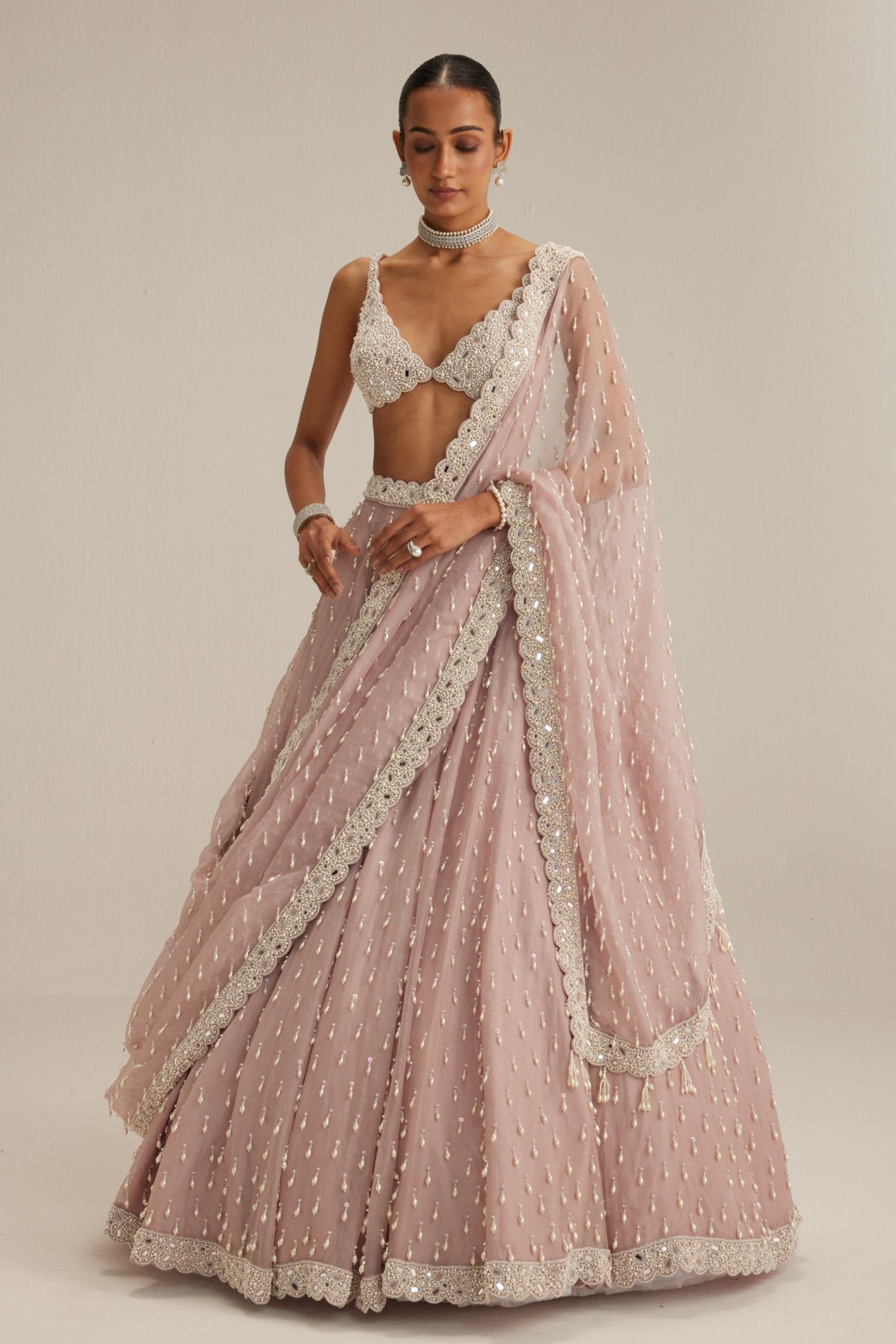 Ash pink organza lehenga set with pearl drop detailing by Vvani By Vani Vats captures romantic elegance. The organza fabric ensures fluid drape, while the delicate embellishments add dimension and grace. Perfect for wedding functions and receptions, this lehenga set enhances the bridal wardrobe with a fresh twist. The ash pink tone creates a contemporary yet timeless palette, appealing to modern brides and festive enthusiasts alike. Designed for comfort and style, this lehenga set is a versatile investment piece that works beautifully for day or night ceremonies. A true example of understated luxury.