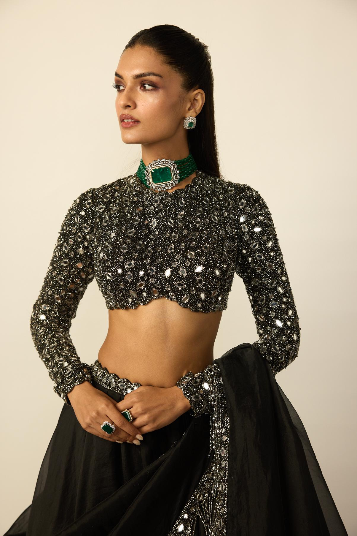 The Black Tassel Dupatta lehenga set is curated for bold wedding statements and glamorous evening celebrations. The dramatic black palette paired with tassel detailing makes it perfect for receptions, cocktail nights, and sangeet events. Designed for women who love striking silhouettes, this lehenga balances drama with elegance.
