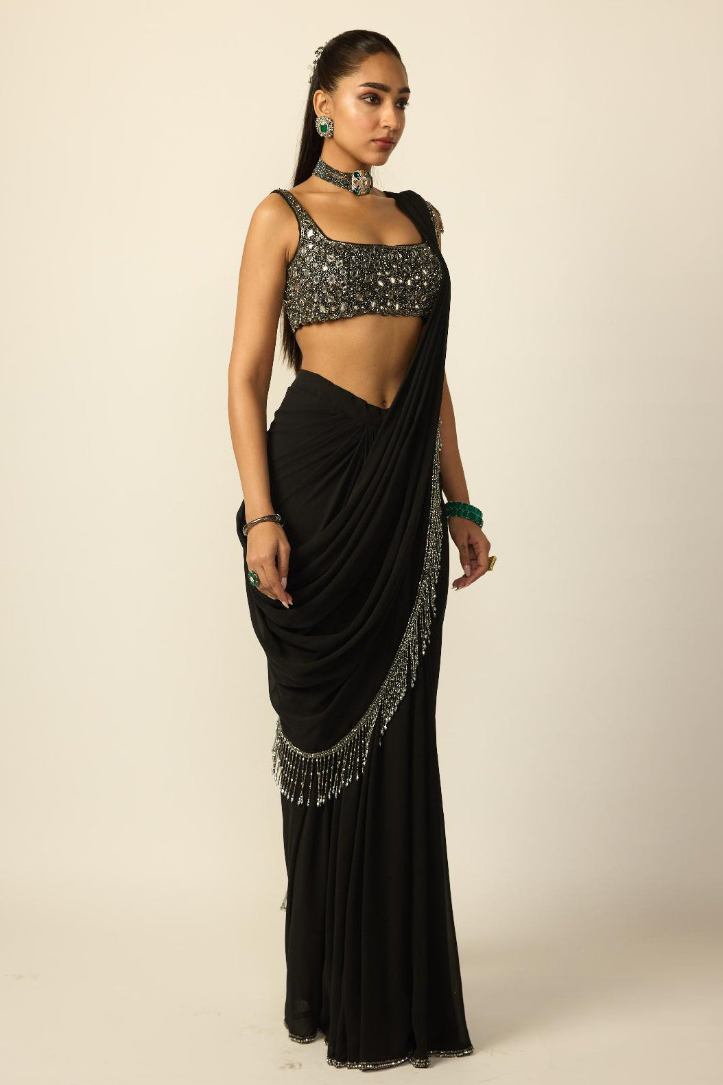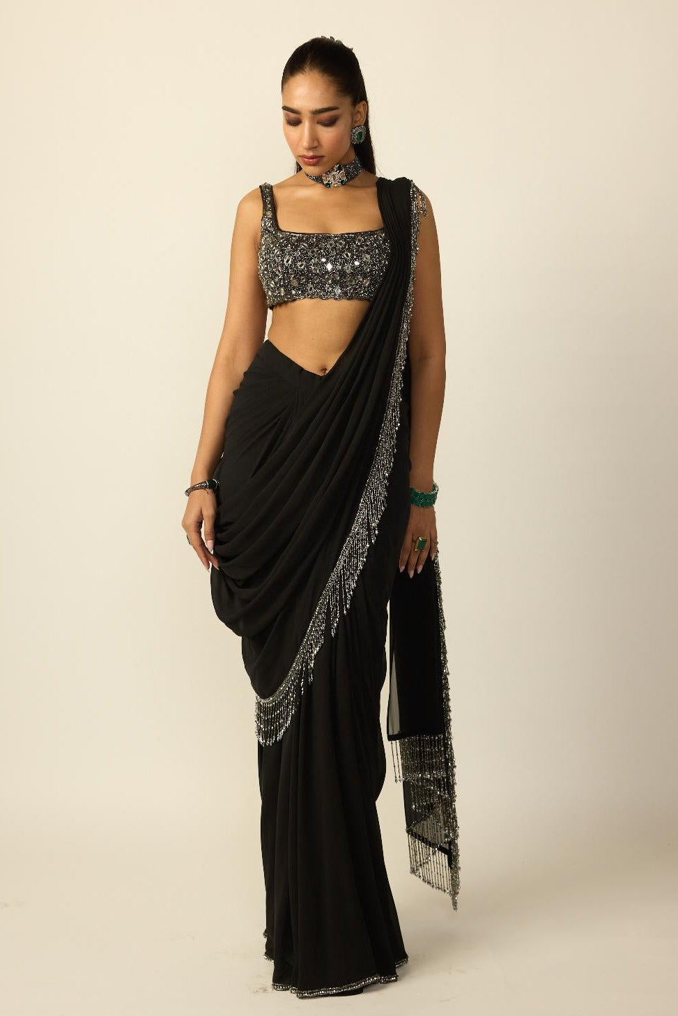 The Black Tassel saree set is curated for modern wedding celebrations and evening festivities. Its sleek drape and tassel accents make it ideal for receptions, cocktail events, and festive gatherings. Designed for women who prefer contemporary sarees with character, this ensemble offers elegance with ease.