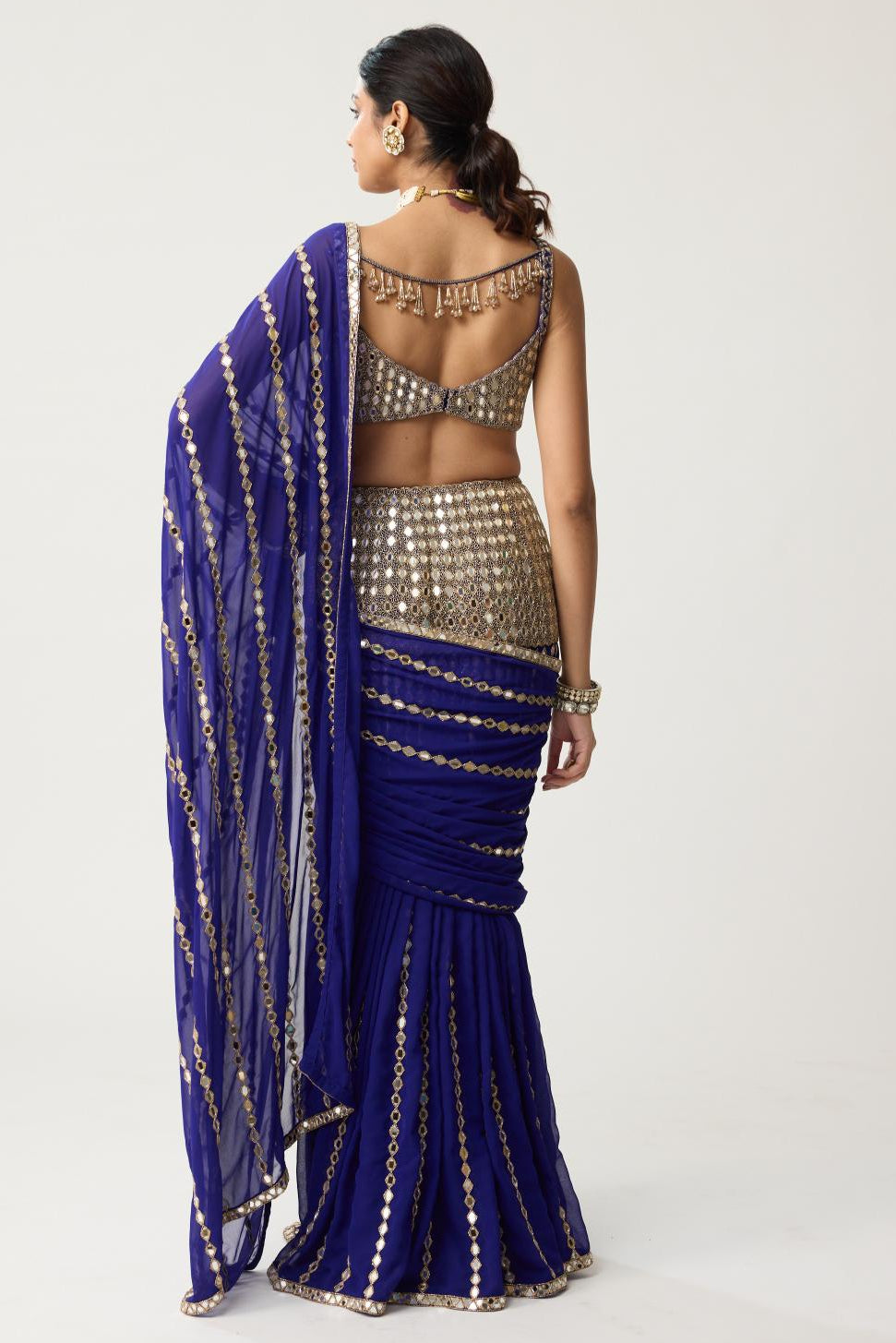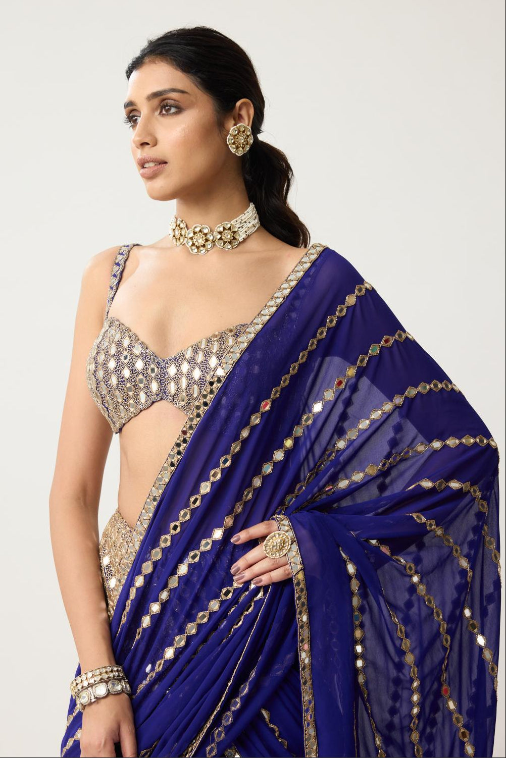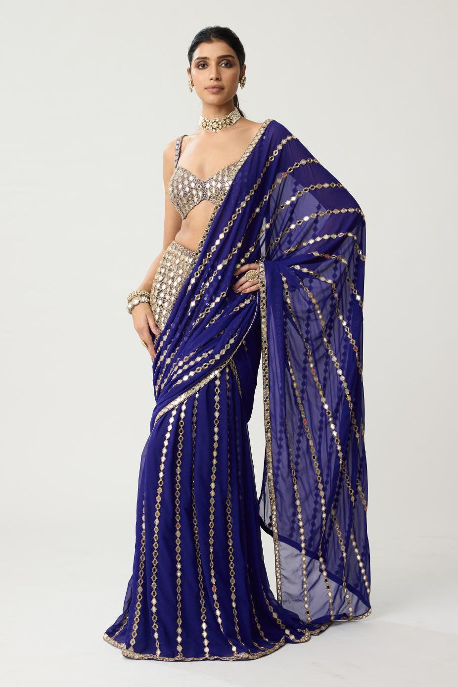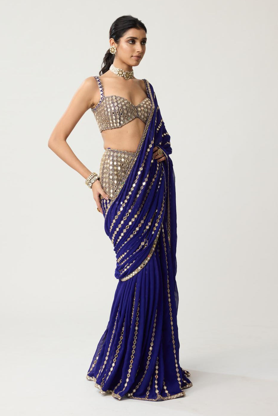 The linear mirror saree set by Vvani by Vani Vats is a masterpiece of contemporary elegance. Crafted in a striking blue hue, the fitted silhouette accentuates your form, while linear mirror detailing adds structured shimmer. Perfect for receptions, evening cocktails, and destination weddings, this saree set bridges tradition and modernity. The polished tailoring and fine embellishments make this ensemble ideal for those who love refined glamour with a confident edge.
