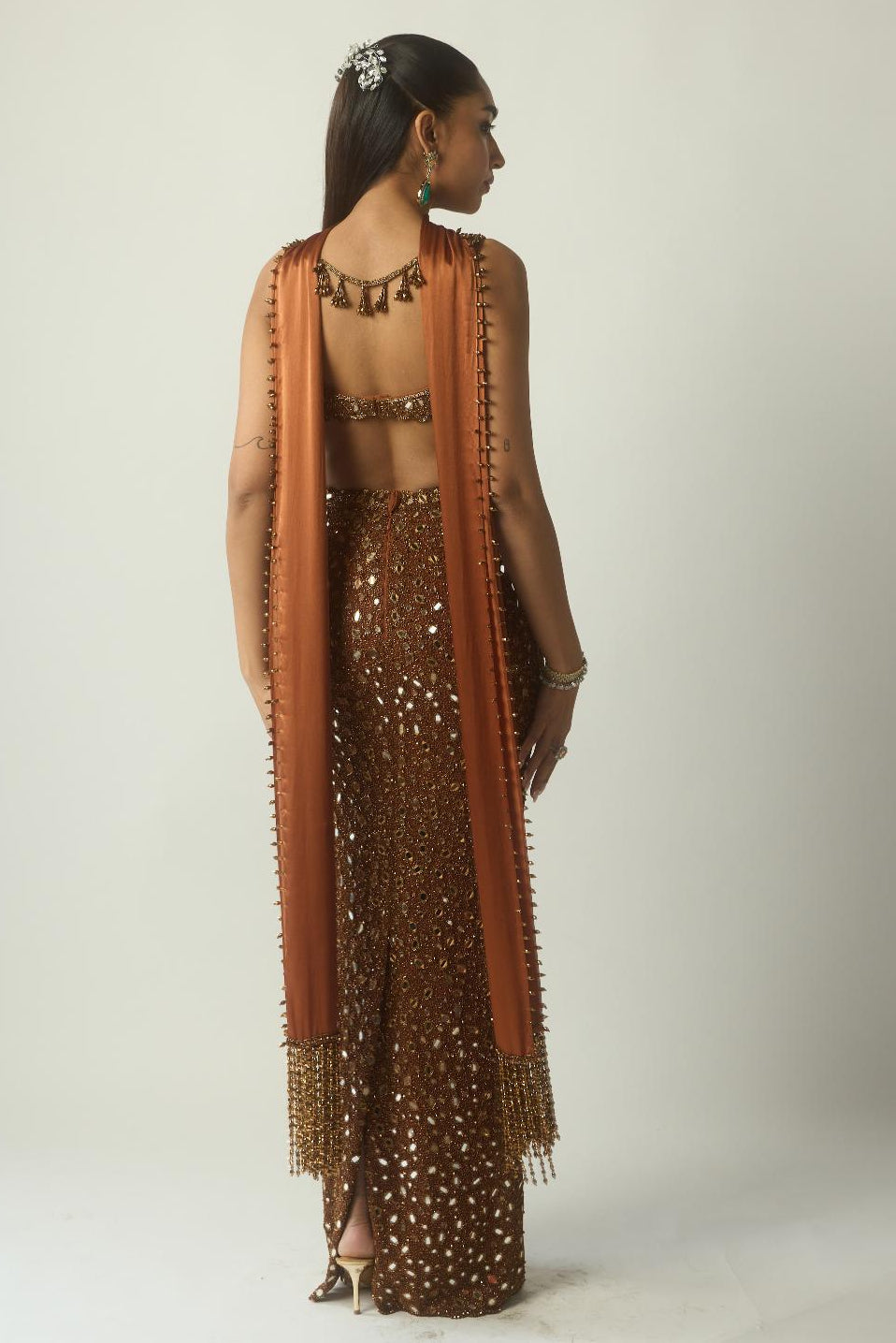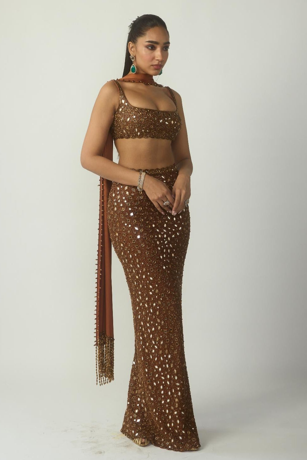 The Brown Copper pencil skirt set is curated for contemporary festive occasions and stylish wedding gatherings. Its sleek silhouette makes it ideal for cocktail parties, festive dinners, and modern celebrations. Designed for women who love tailored elegance, this set offers refined glamour.