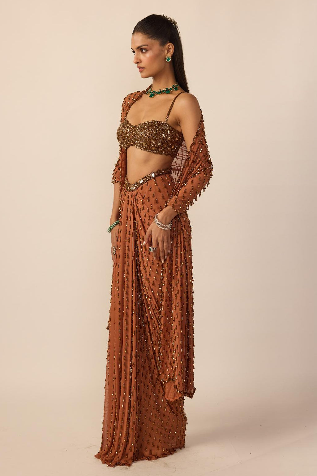 The Brown Copper Single Drop saree set is curated for refined evening weddings and festive gatherings. The single drop detailing adds subtle drama, making it ideal for cocktail nights and receptions. Designed for women who prefer understated statement pieces, this saree offers timeless elegance.