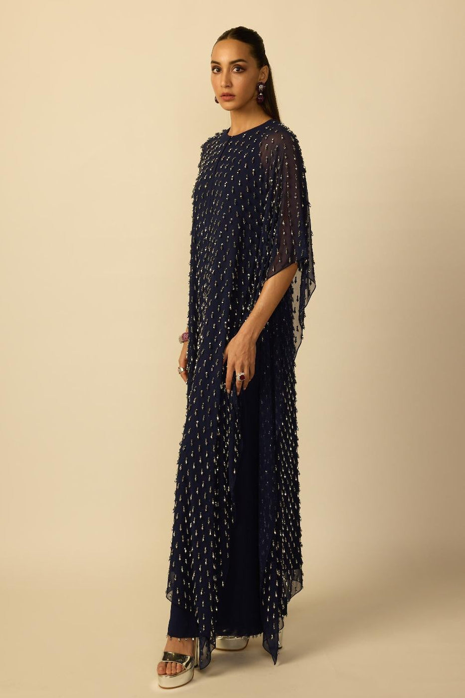 The Deep Blue Silver Drop kaftan by Vvani By Vani Vats is designed for contemporary festive dressing. Crafted with a relaxed silhouette, this kaftan allows ease of movement while maintaining a luxe drape. The deep blue shade enhances the silver detailing, making this kaftan ideal for evening events. Designed for versatility, the kaftan transitions seamlessly from weddings to festive dinners. Its lightweight construction ensures the kaftan remains comfortable during long celebrations. Style this kaftan with minimal jewellery for a modern Indian wedding look.