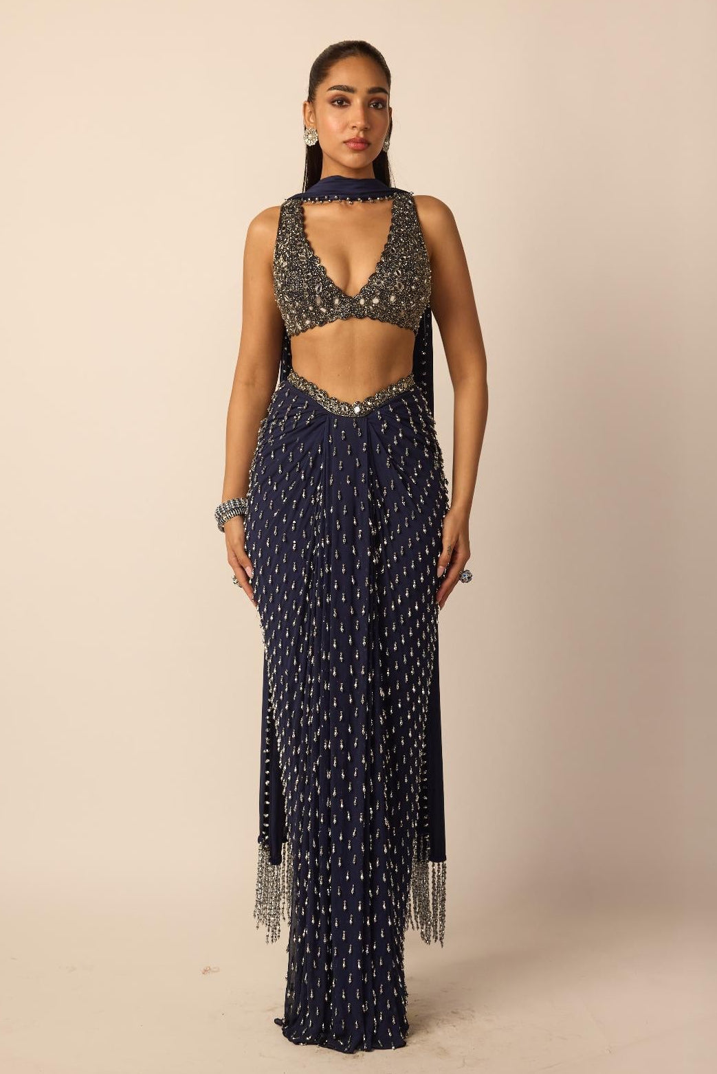 The Deep Blue Single Drop draped skirt by Vvani By Vani Vats is designed for contemporary festive styling. This draped skirt offers a fluid silhouette with a clean finish. The deep blue tone elevates the draped skirt, making it suitable for evening events. Crafted for comfort, the draped skirt allows effortless wear. Ideal for weddings, the draped skirt delivers elegance with minimal styling.