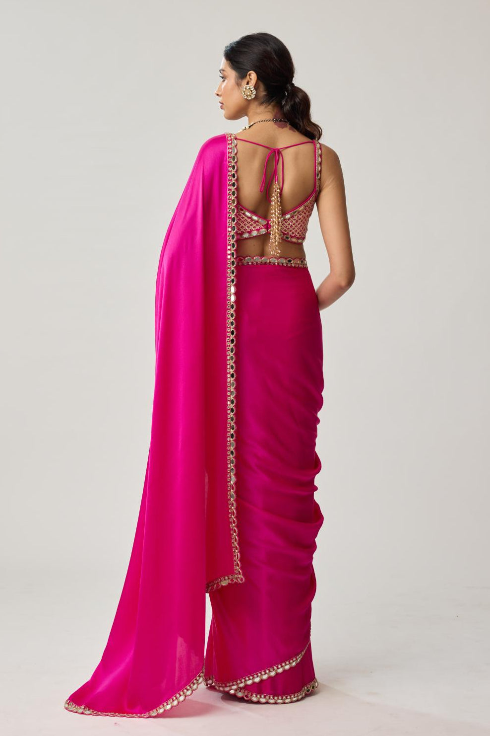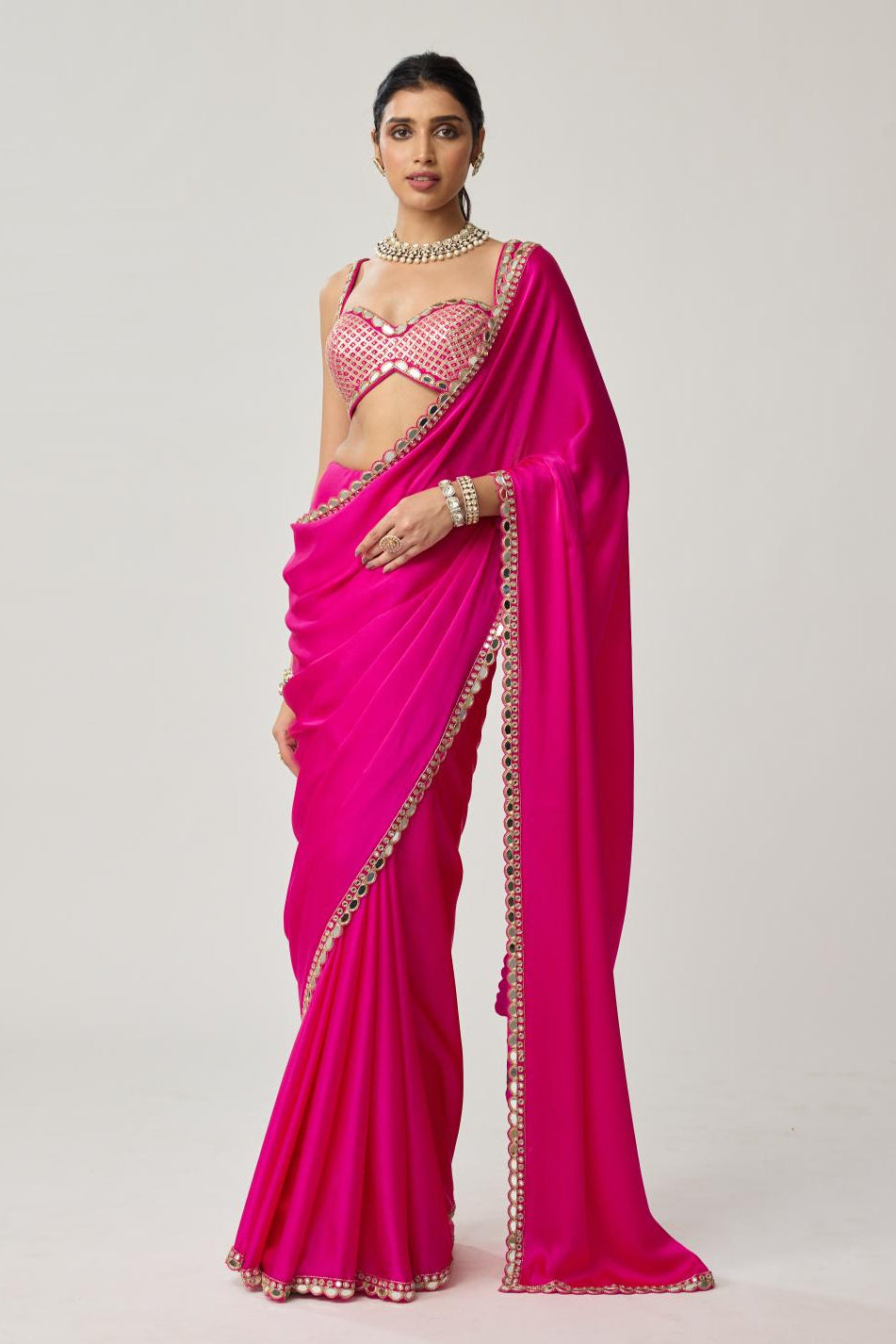 The gota mirror saree set in fuchsia pink by Vvani by Vani Vats is a vibrant statement of craftsmanship and celebration. The drape is highlighted with traditional gota embroidery and reflective mirror accents, adding brilliance and movement to the fabric. Perfect for sangeets, mehendi functions, or day weddings, this saree set combines classic artistry with a fresh, modern color. Its soft satin texture and glowing pink tone ensure you dazzle with confidence and charm.