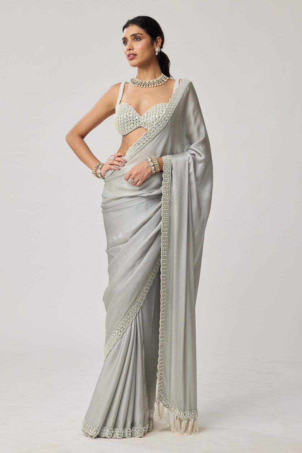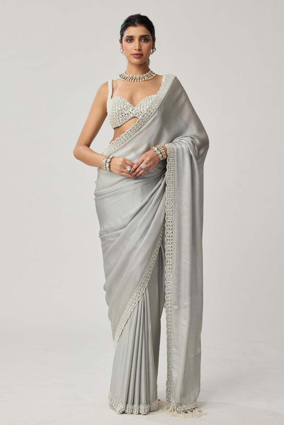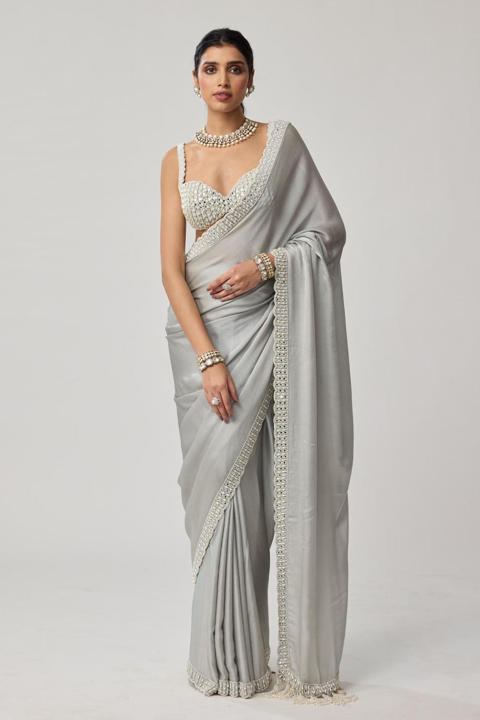 Elevate your festive style with the Gray chiffon pearl and mirror saree set by Vvani by Vani Vats. This graceful saree set features delicate pearl and mirror embellishments that shimmer subtly against the chiffon base. Designed for women who favor elegance over extravagance, this saree set is perfect for weddings, cocktail events, and evening galas. Lightweight and breathable, the saree set ensures comfort while maintaining an aura of luxury. A timeless saree set that celebrates the fusion of tradition and modern refinement.