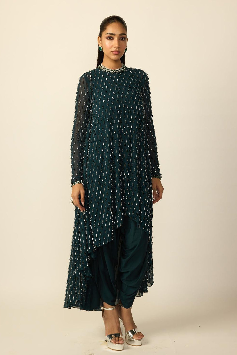 The Green Teal Drop kurta set by Vvani By Vani Vats is designed for modern festive occasions. This kurta set features a relaxed yet structured silhouette that ensures comfort throughout the day. The green teal tone enhances the kurta set, making it suitable for weddings and celebrations. Delicate drop detailing adds interest, allowing the kurta set to stand out subtly. Crafted for versatility, the kurta set works well for both daytime and evening events. Easy to style, the kurta set pairs beautifully with minimal jewellery for a polished contemporary look.