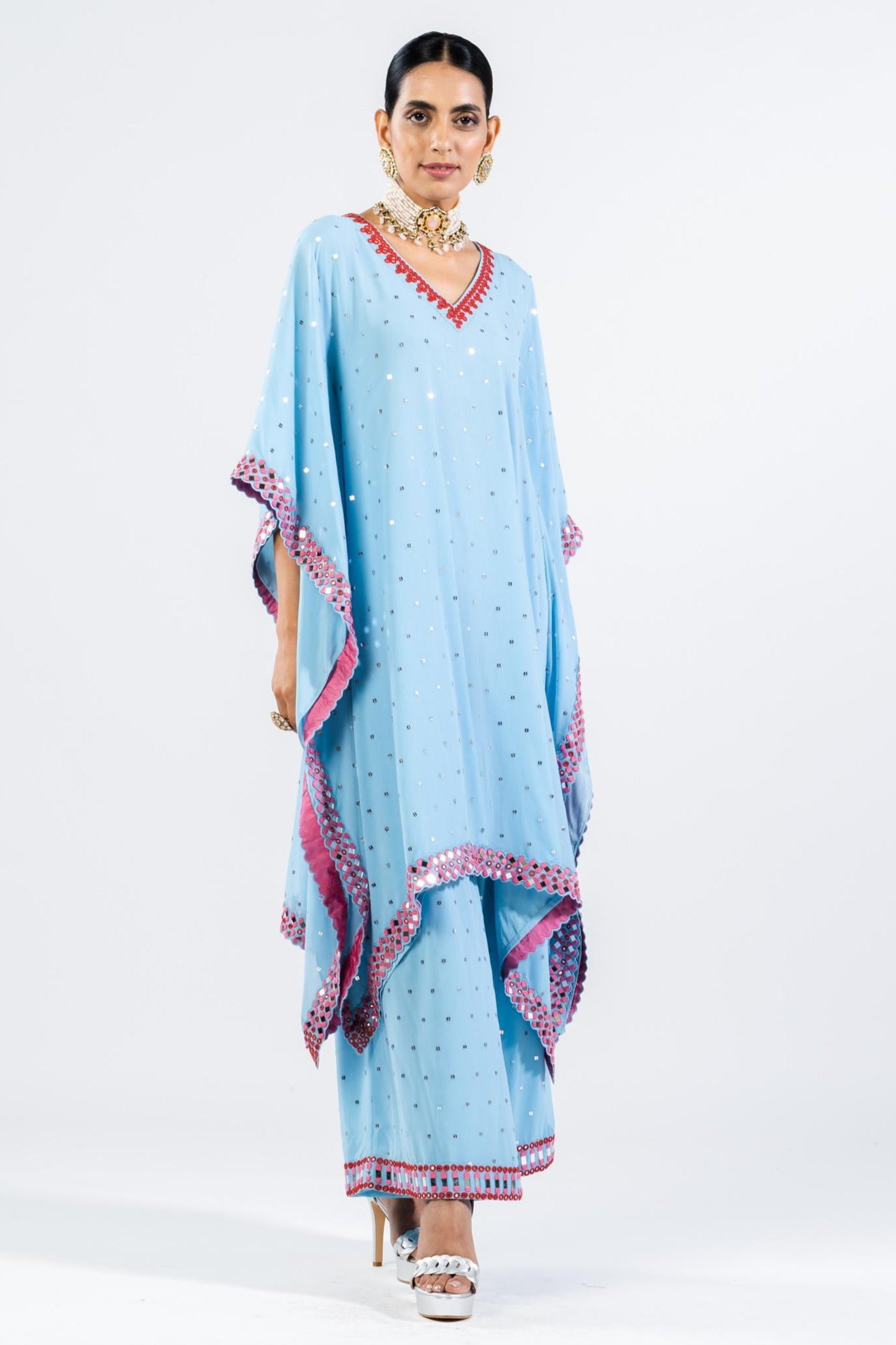 Radiate effortless grace with this ice blue kaftan set by Vvani By Vani Vats. Designed for women who embrace modern sophistication, this airy silhouette drapes beautifully while ensuring comfort. Perfect for contemporary gatherings, resort parties, or destination festivities, this kaftan set exudes confidence and style. The ice blue tone adds a calming yet striking presence, while the relaxed fit ensures wearability across occasions. Ideal for women who want a versatile yet luxurious look, this kaftan set seamlessly pairs with statement earrings or minimal jewelry for chic styling at daytime or evening celebrations.