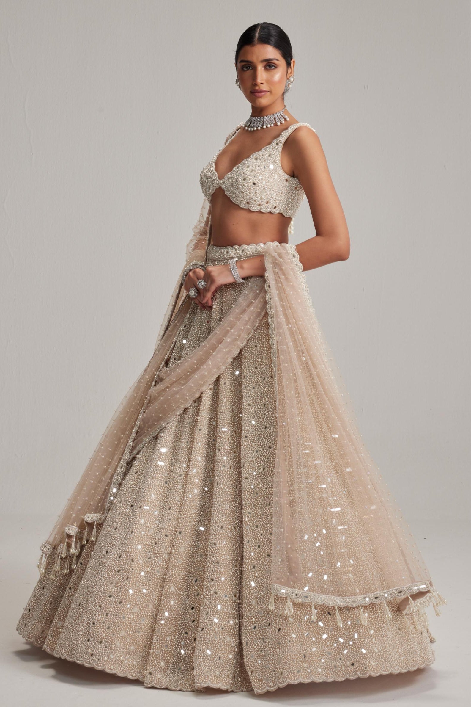 Light beige oas couture lehenga set with double dupatta