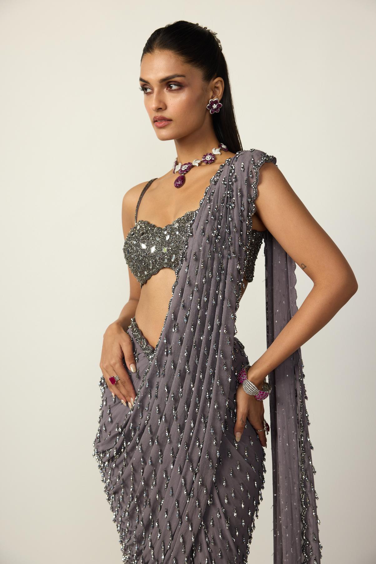 The Metallic Gray draped saree set is curated for glamorous evening weddings and cocktail celebrations. The pre-draped silhouette ensures ease of wear, while the metallic finish adds drama. Ideal for receptions and modern festive occasions, this saree set offers effortless sophistication.