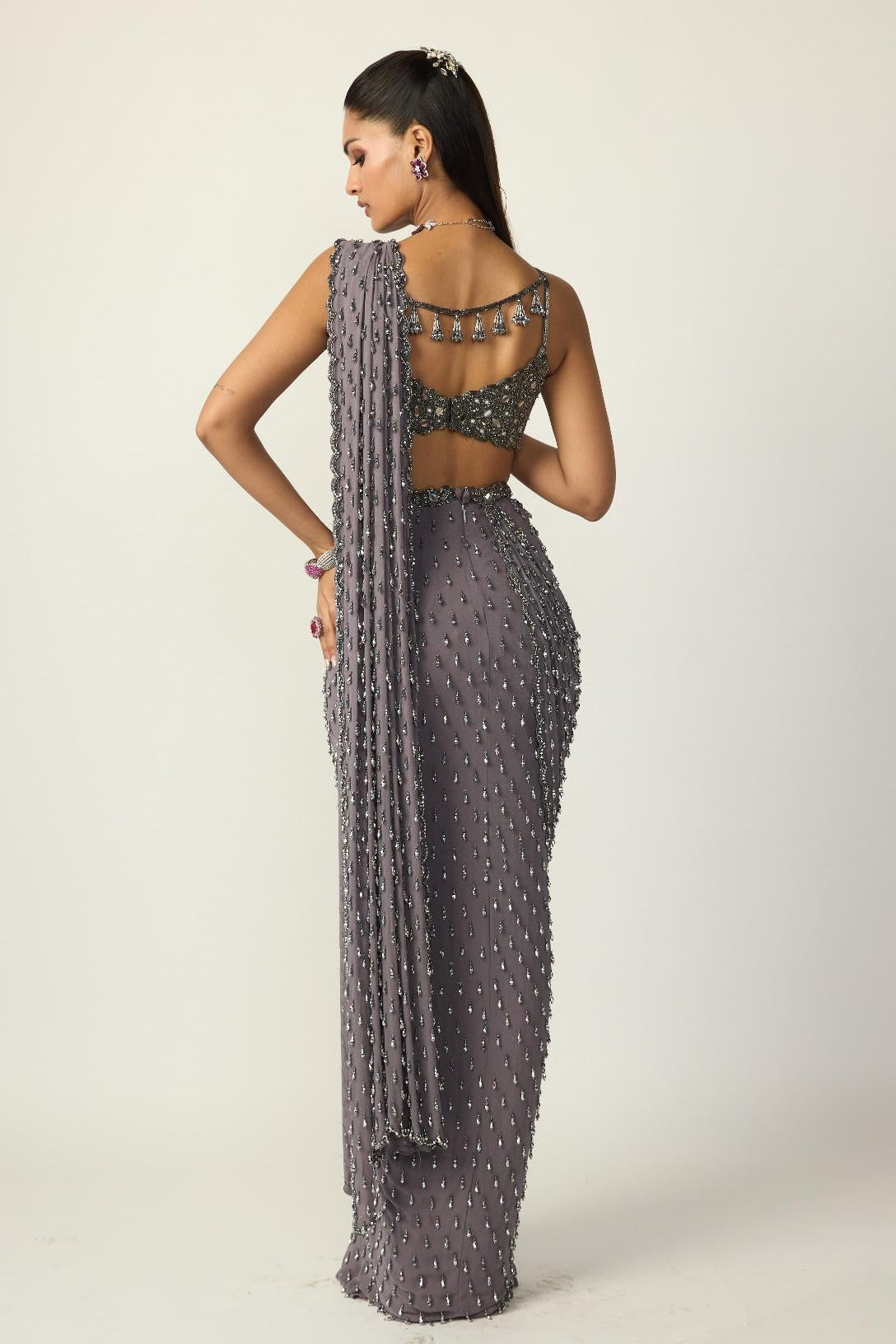 The Metallic Gray draped saree set by Vvani By Vani Vats is designed for contemporary celebrations. This draped saree offers a fluid silhouette that is easy to wear and style. The metallic gray tone elevates the draped saree, making it ideal for evening events. Crafted for comfort, the draped saree allows movement without compromising elegance. Perfect for receptions, this draped saree creates a statement with minimal effort. Style this draped saree with sleek jewellery for a refined look.