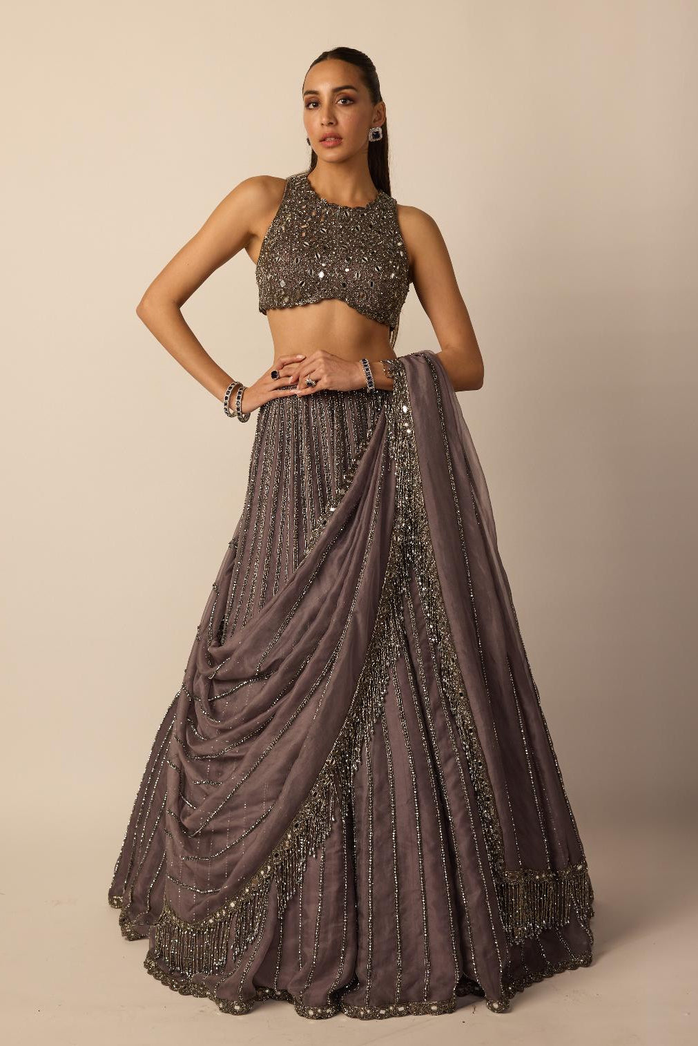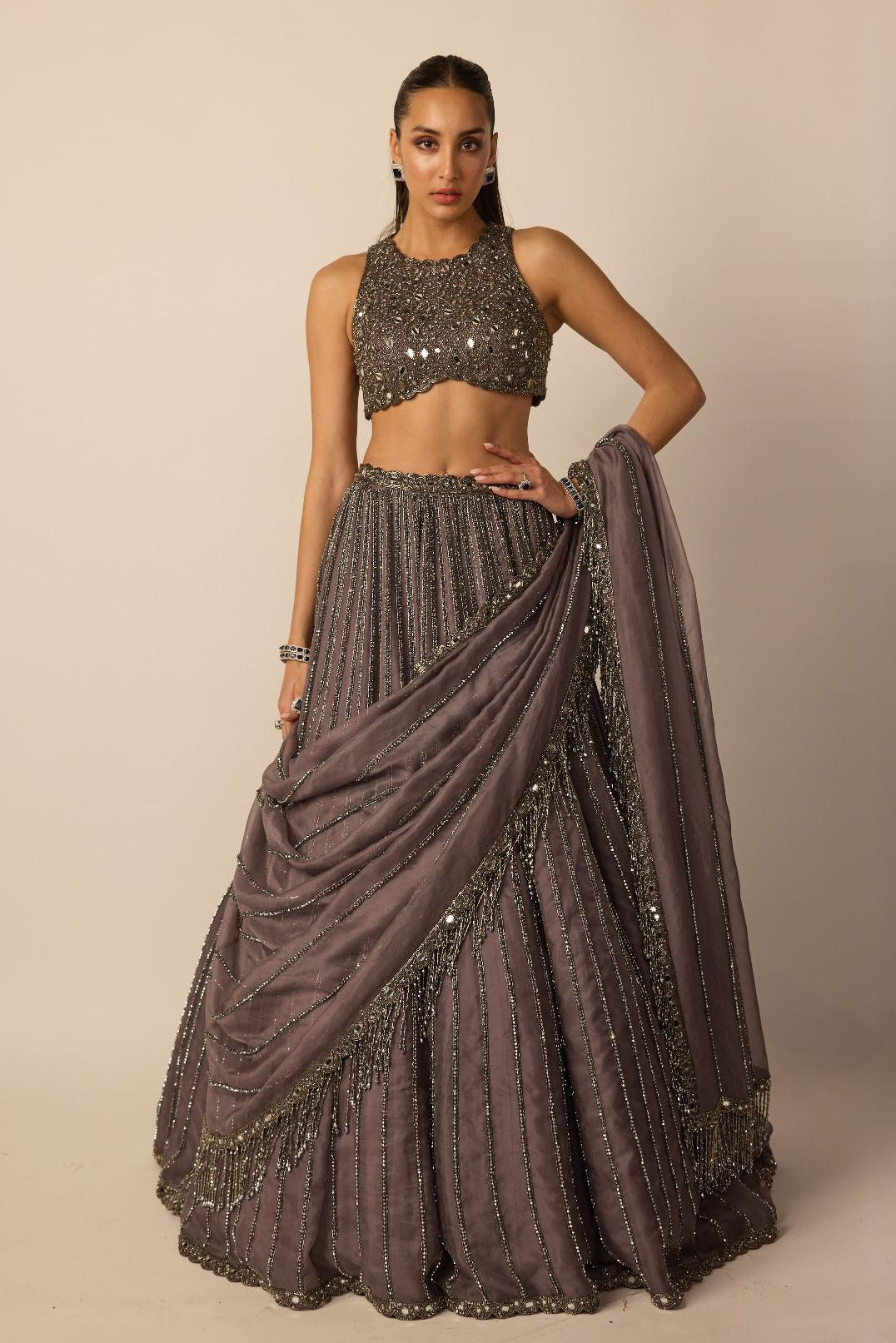 The Metallic Gray Linear lehenga set is curated for modern wedding receptions and statement celebrations. Linear detailing adds definition, while the metallic palette creates a bold visual presence. Ideal for contemporary brides and festive evenings.