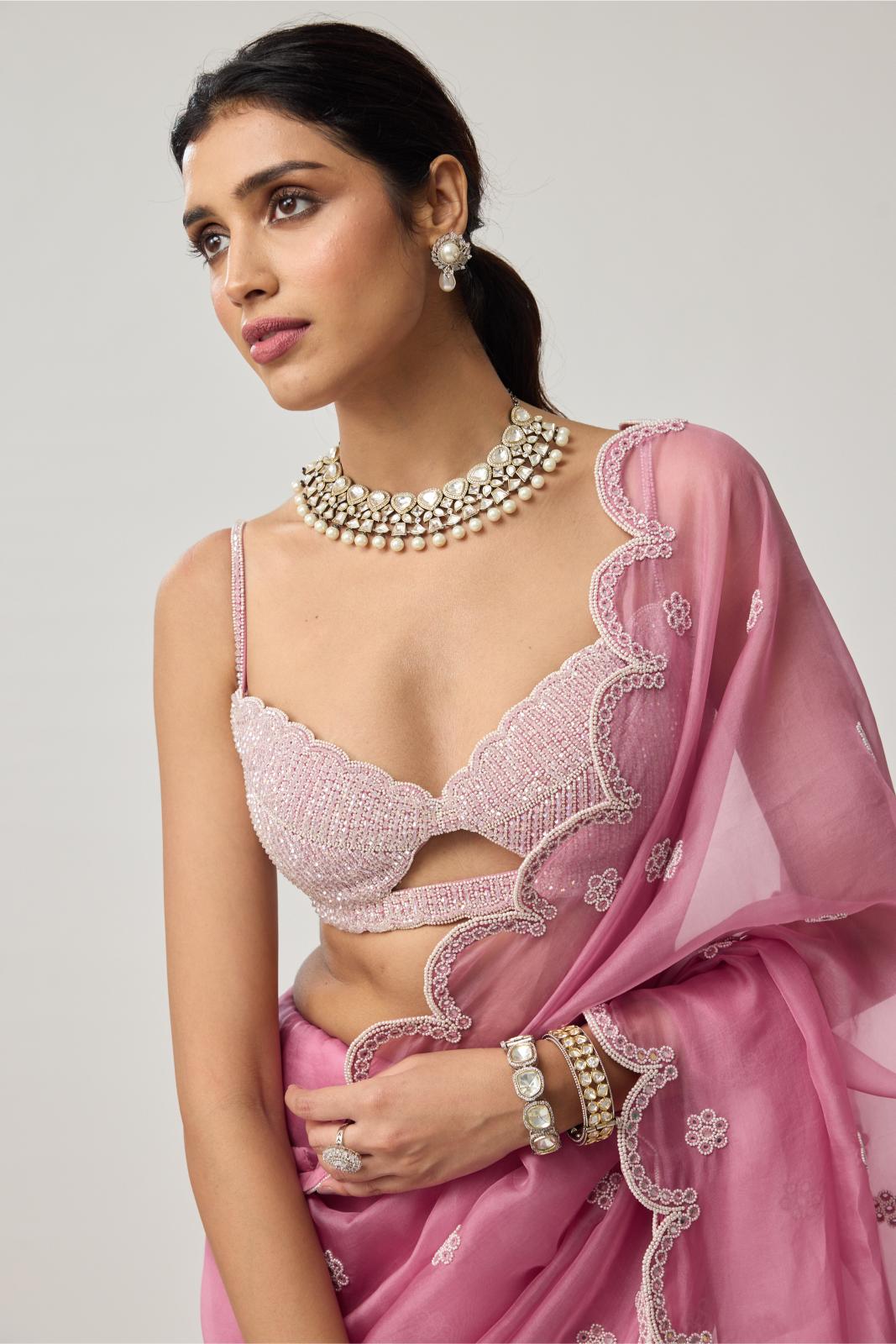 Elevate your wardrobe with the Onion pink organza pearl saree set from Vvani by Vani Vats. This stunning saree set features a breezy organza drape adorned with delicate pearls that glisten subtly under the light. Perfect for festive occasions or modern weddings, this saree set embodies refined femininity and delicate craftsmanship. The organza texture keeps the saree set lightweight yet regal, making it ideal for both day and evening wear. A timeless saree set that radiates charm, poise, and modern elegance.
