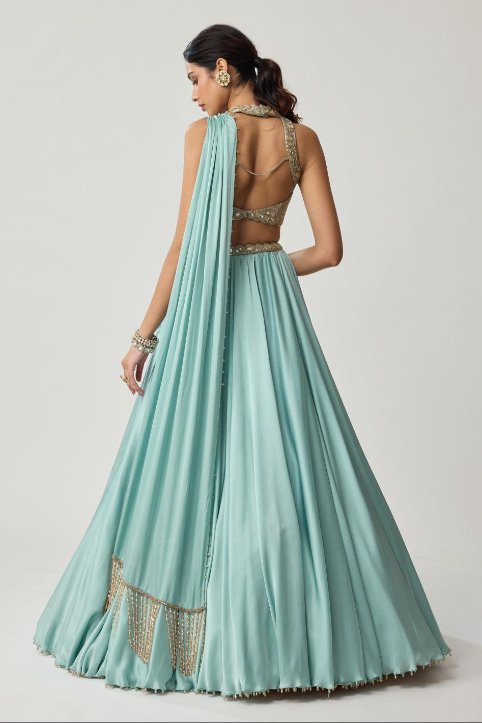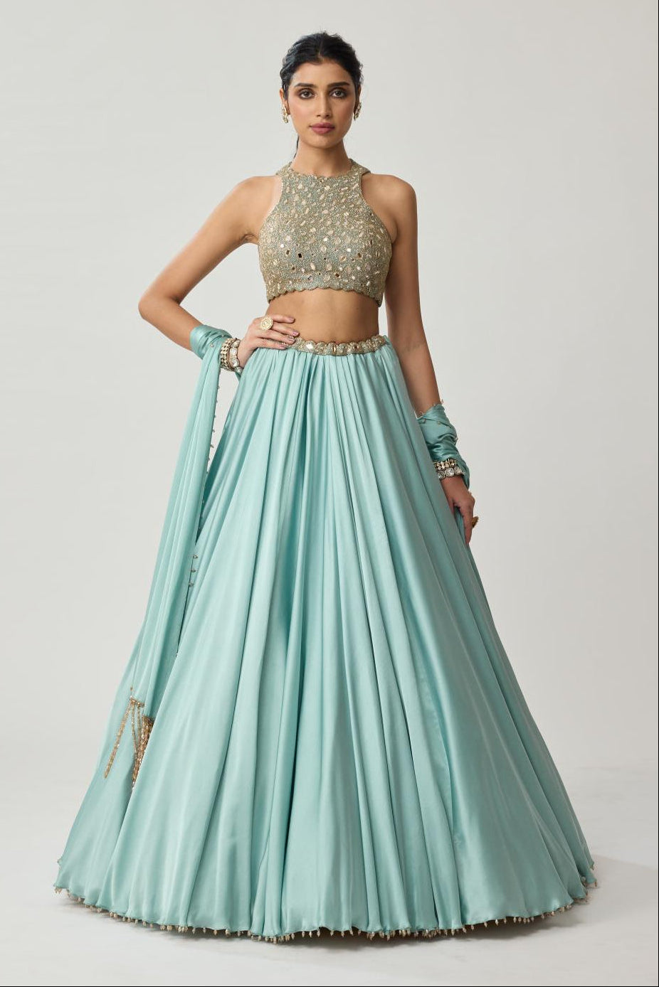 Step into the spotlight with our mirror satin skirt set, designed to make your festive look shine. This mirror satin skirt set features fine mirror work detailing across a sleek blouse and fluid satin skirt. The powder blue tone adds a serene yet celebratory touch, perfect for day events, receptions, and modern weddings. Crafted in satin, the mirror satin skirt set drapes beautifully, adding effortless movement to every step. Elevate your style quotient with this mirror satin skirt set from Vvani by Vani Vats that seamlessly merges comfort, luxury, and contemporary flair.