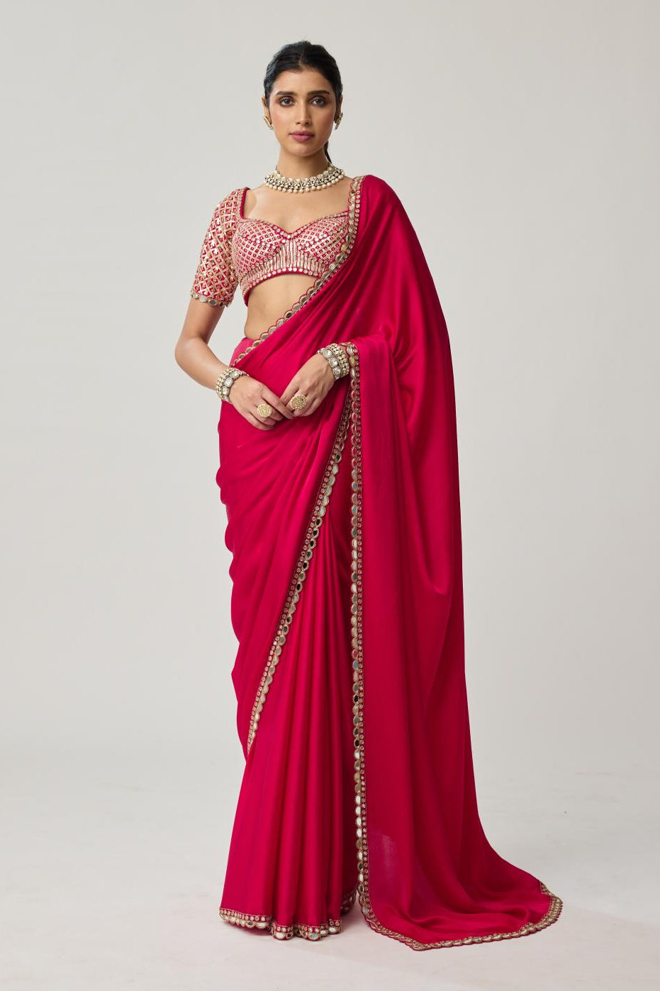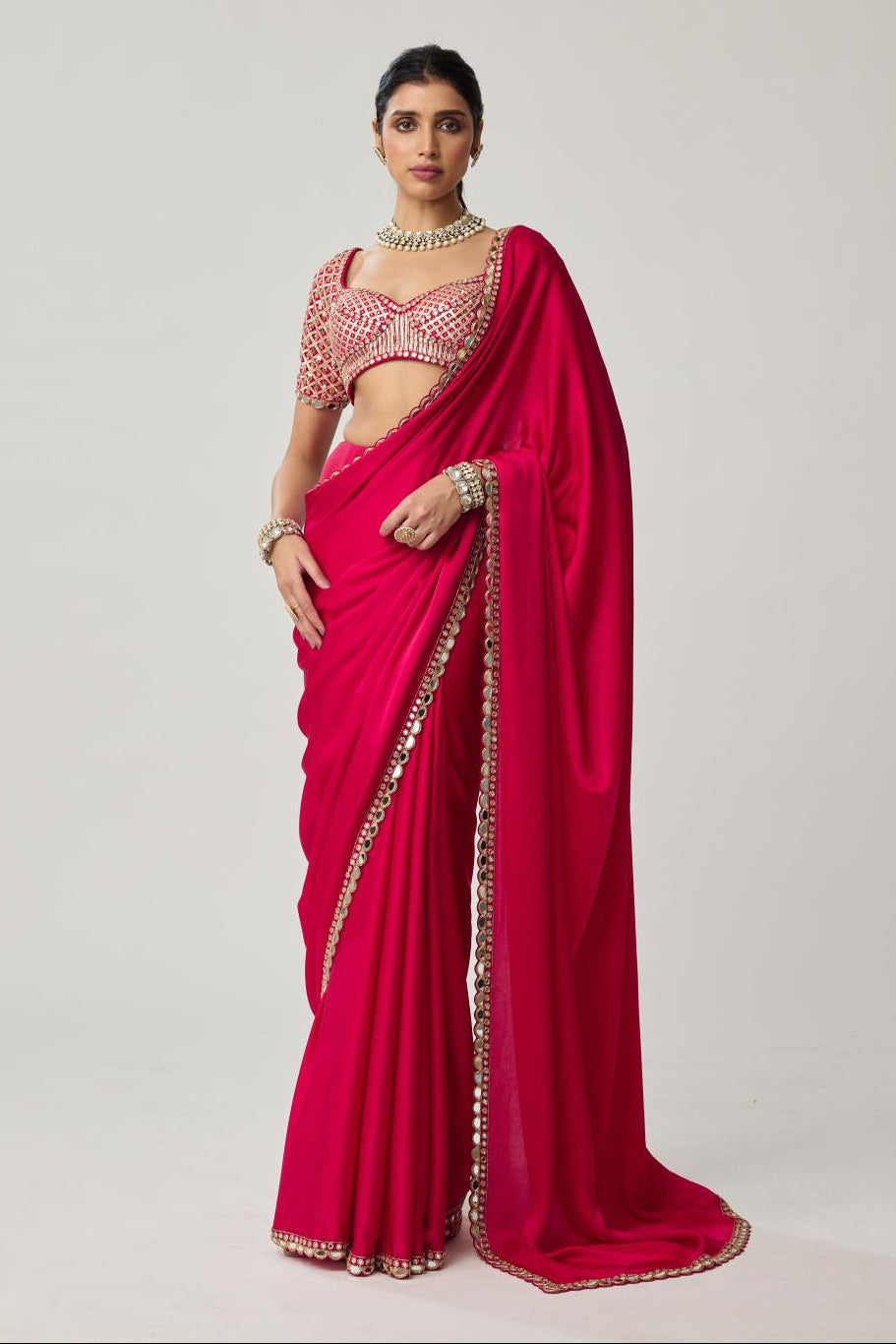 Elevate your festive charm with our gota mirror satin saree set in vibrant red. This gota mirror satin saree set by Vvani by Vani Vats is crafted from fluid satin and detailed with handcrafted gota and mirror work. The gota mirror satin saree set creates a graceful silhouette that blends luxury with heritage. Designed for grand occasions, this gota mirror satin saree set celebrates Indian artistry in a modern way. Capture all eyes in this gota mirror satin saree set that radiates warmth and sophistication.