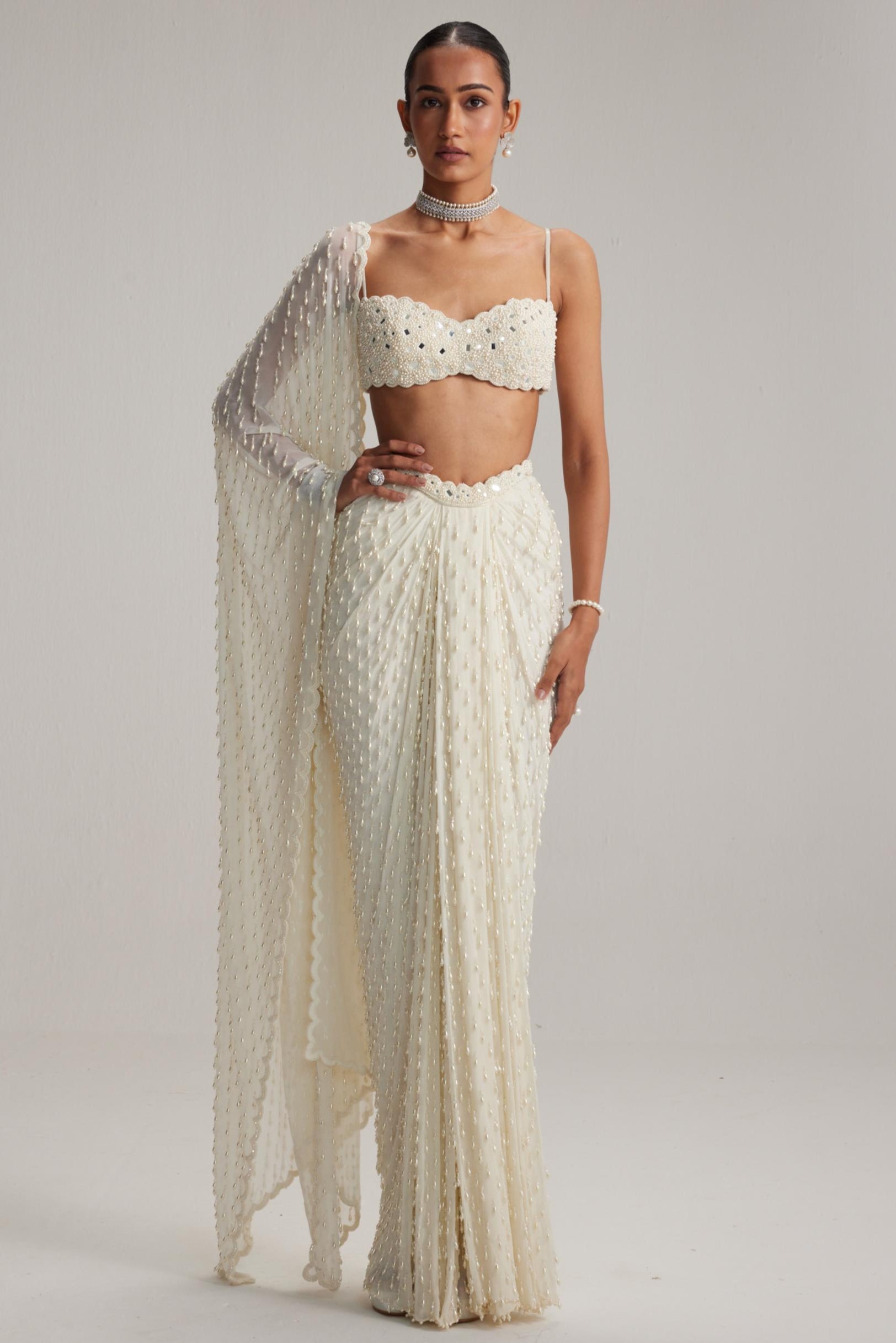 The White Oas Draped Skirt Set by Vvani By Vani Vats is a flawless balance of modern glamour and timeless elegance. Designed for cocktail and sangeet celebrations, this skirt set highlights a draped silhouette that flatters the figure while offering fluid movement for festive dancing and joyful moments. Its pristine white base is elevated by subtle detailing, making it an ideal choice for women who wish to blend simplicity with sophistication. This skirt set is versatile enough to be styled with statement jewelry for bold drama or kept minimal for refined charm. Perfect for wedding functions, it speaks to the modern woman’s love for effortless glamour while honoring traditional artistry with a contemporary twist.