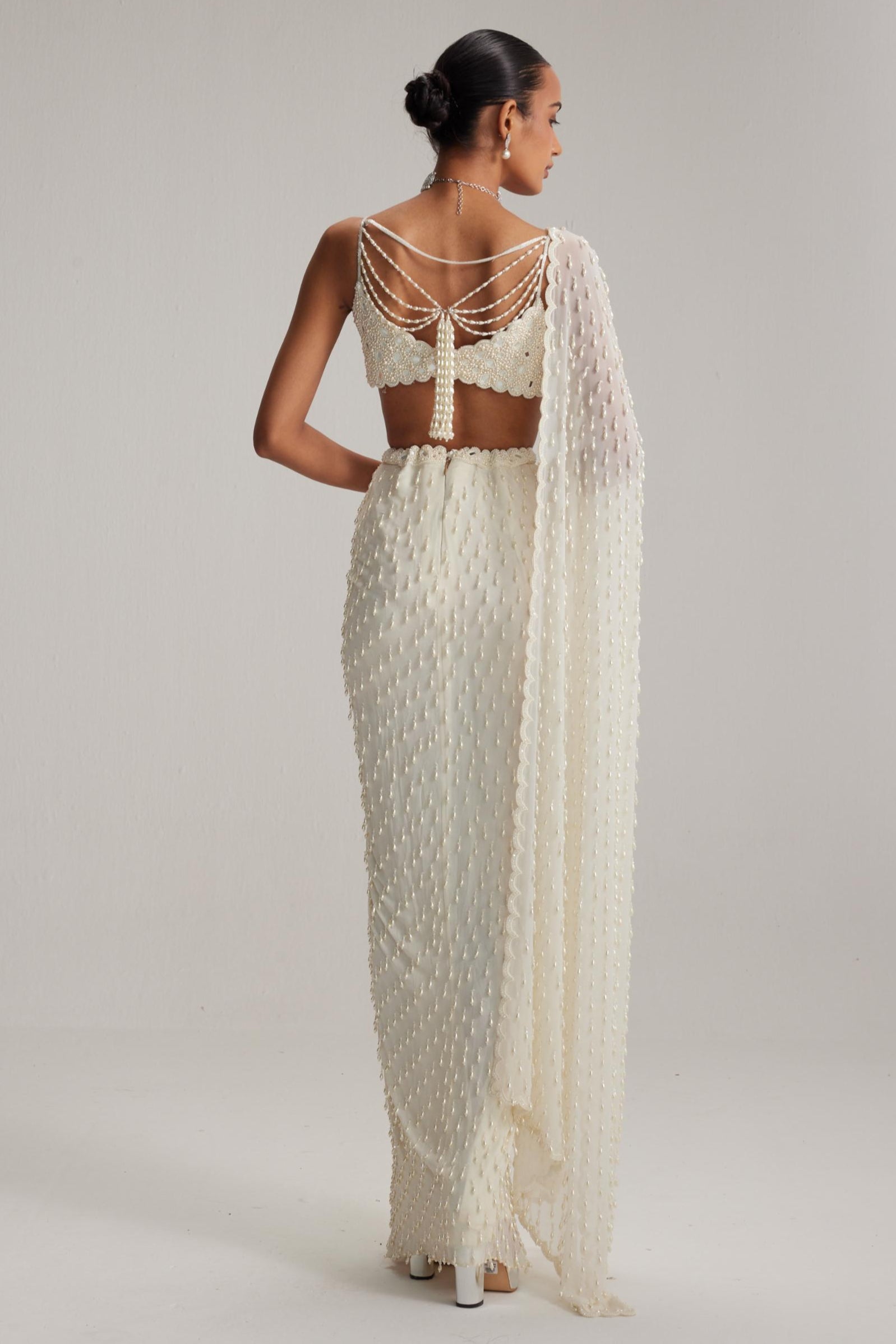Vvani By Vani Vats presents the White Oas Draped Skirt Set, a masterpiece designed for the woman who desires effortless elegance during cocktail nights and sangeet functions. This skirt set exemplifies refined craftsmanship, combining draped artistry with modern tailoring for a striking look that feels both bold and graceful. The highlight of this skirt set is its flowing draped silhouette, which adds drama and sophistication to every movement. Its pristine white base symbolizes purity and charm, while delicate details infuse understated luxury. The skirt set offers a versatile style statement that adapts to both grand celebrations and intimate gatherings, ensuring the wearer always feels radiant and memorable. Beyond aesthetics, the White Oas Draped Skirt Set is designed for comfort and practicality. Its lightweight structure and thoughtful draping ensure ease of movement, making it ideal for festive dancing and long hours of celebration. Unlike heavier outfits, this skirt set delivers glamour without compromise. Styling possibilities with this skirt set are endless. Pair it with dazzling jewelry for a show-stopping look or opt for minimal accessories for contemporary chic. Its ability to balance traditional influences with a global-inspired design makes it an essential addition to a modern festive wardrobe. This skirt set is not only suited for brides seeking unconventional yet glamorous choices but also for wedding guests who want to make an impression at cocktail and sangeet evenings. Every detail of the White Oas Draped Skirt Set showcases Vvani By Vani Vats’ mastery in merging heritage craftsmanship with contemporary appeal. More than just a skirt set, this creation is a celebration of individuality, confidence, and elegance, ensuring that every festive moment is unforgettable.