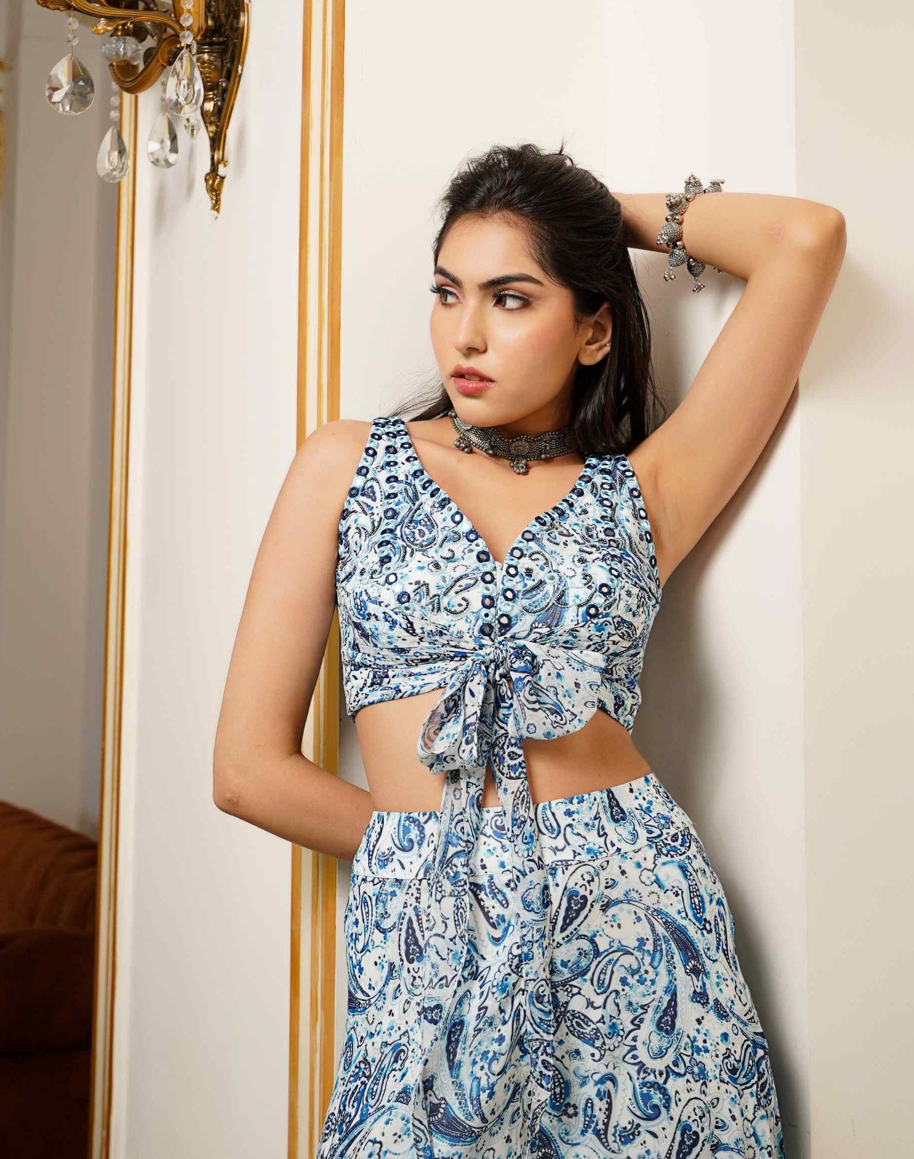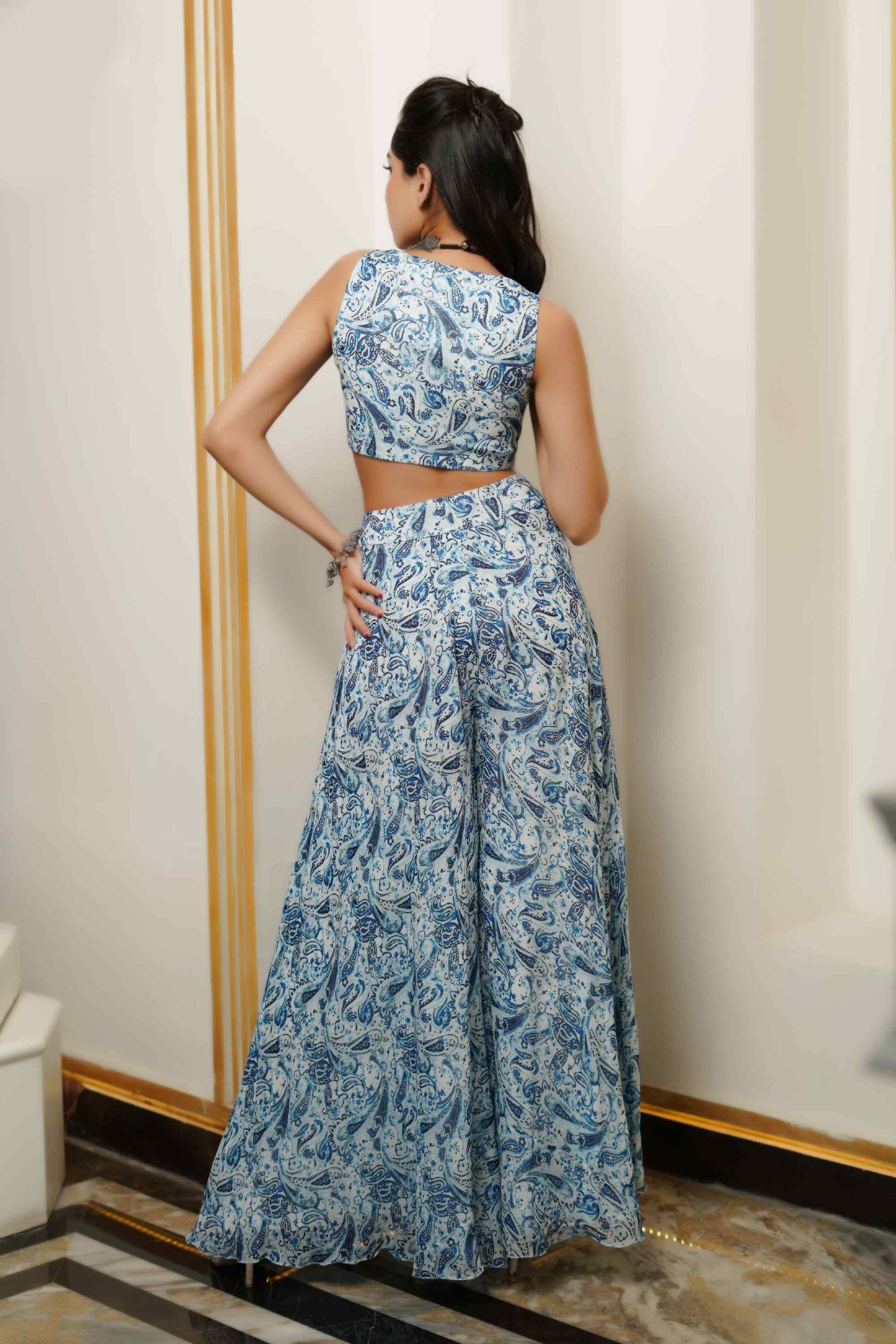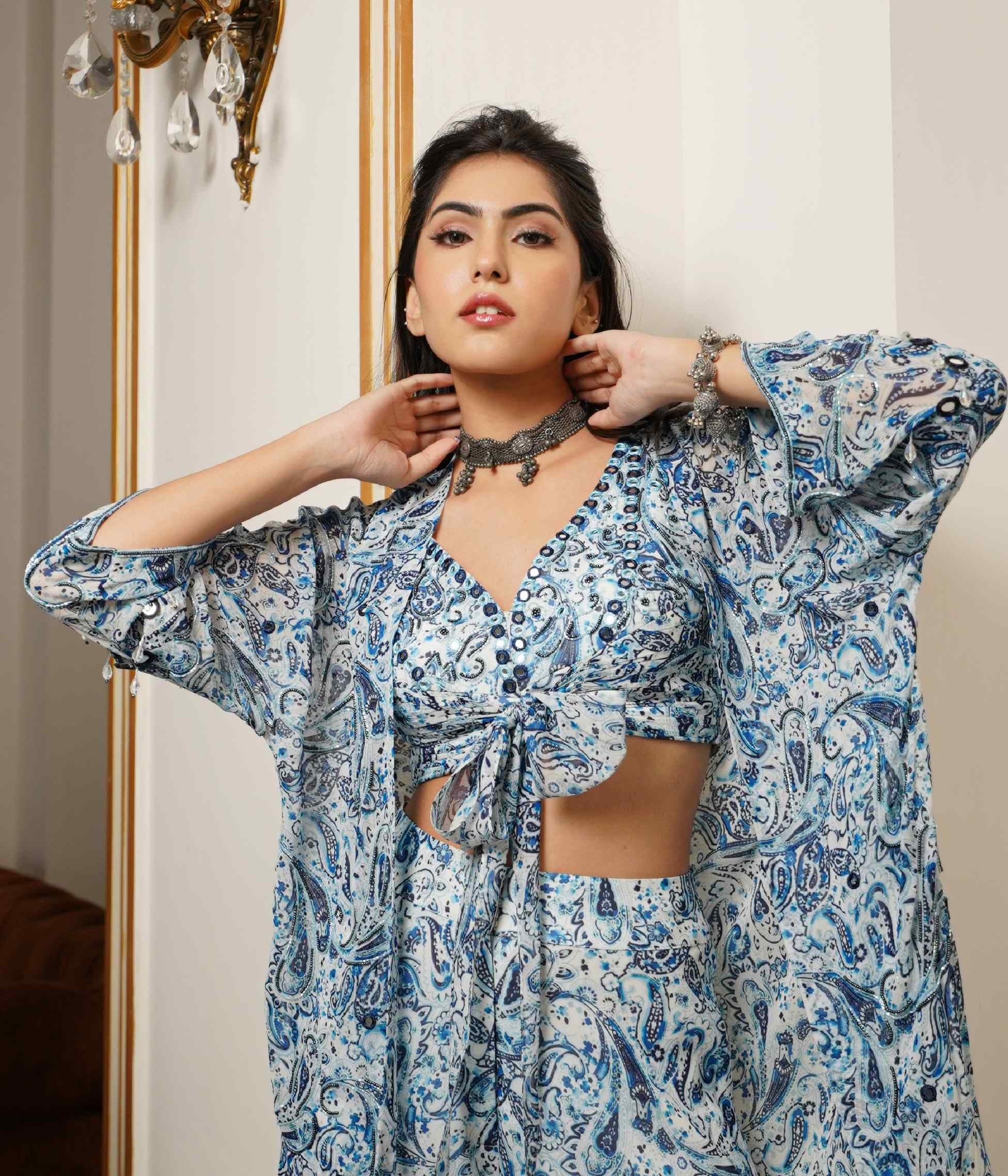Step into sophistication with this stunning set, featuring a padded bustier with elegant front knot detailing and adorned with intricate embellishments including mirrors, cutdana, moti, and resham. The high-waist flared palazzo adds a touch of grace and volume, creating a refined silhouette. Complementing the ensemble is a 3/4th sleeve kimono shrug, exquisitely handworked with an array of mirrors, resham, moti, cutdana, and crystals for a dazzling finish. Perfect for any upscale event, this set harmonizes opulent detailing with contemporary design for a look that is both striking and unforgettable.