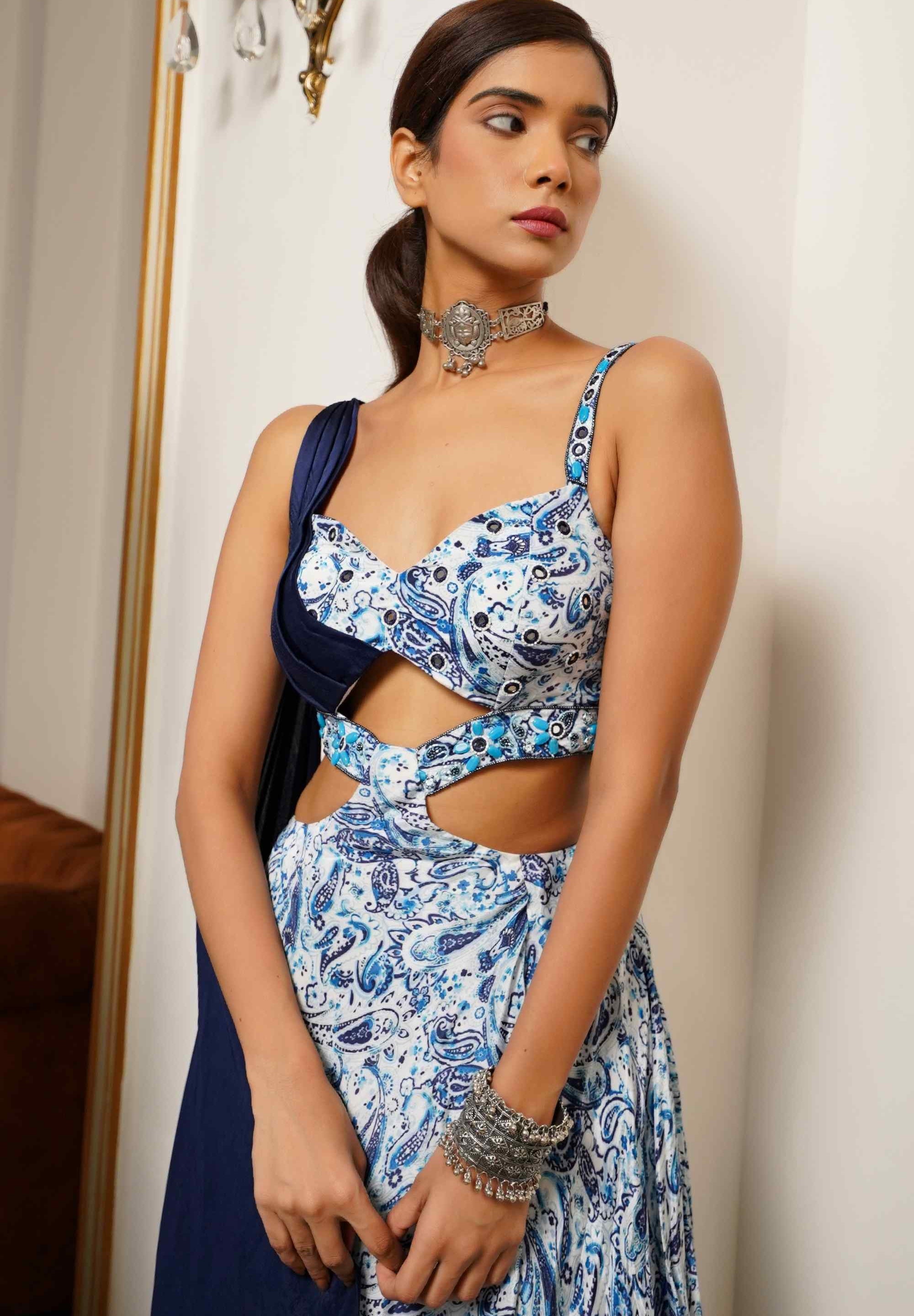 Indulge in elegance with this sophisticated set, featuring a padded bustier adorned with exquisite handwork, including mirrors, cutdana, zardosi, stones, moti, and resham. The waist cut-out long lehenga dress seamlessly attaches to the bustier, creating a cohesive and stunning silhouette. Complementing the look is a plain dupatta in a handkerchief pattern, elegantly attached to the bustier for added grace. Ideal for special occasions, this ensemble combines intricate detailing with a modern, refined design, ensuring you make a memorable impression.