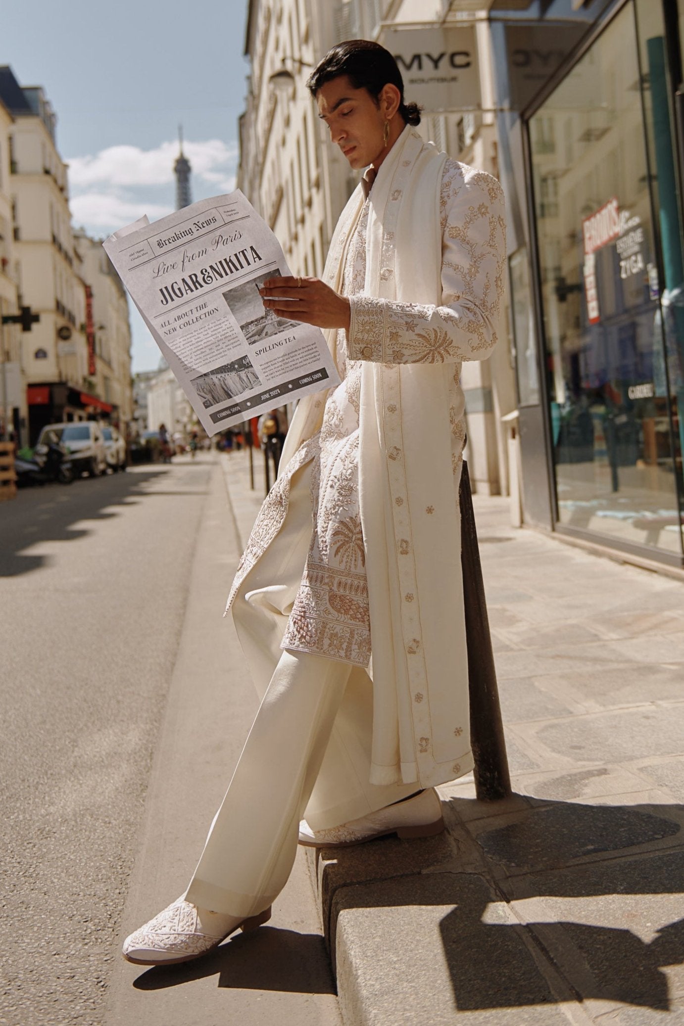 Experience timeless sophistication with our white sherwani set, beautifully adorned with intricate handwork and gold embroidered motifs. Crafted from luxurious raw silk, this sherwani exudes elegance and refinement. Paired seamlessly with a chanderi silk kurta and matching pants, the ensemble is completed with a pristine linen satin dupatta, adding a touch of grace. Perfect for weddings and formal events, this sherwani set offers a blend of classic charm and modern elegance.