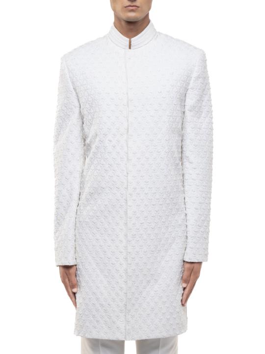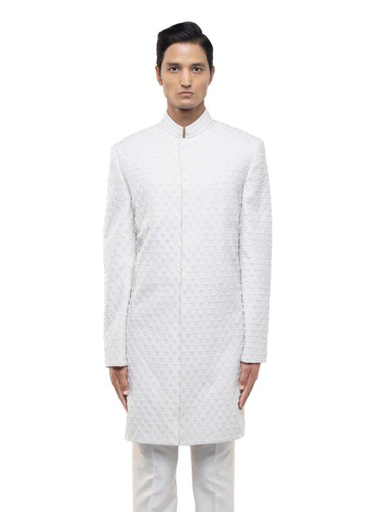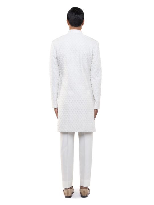 Elegant and radiant, this White Silk Beaded Embroidery Sherwani Set features delicate beadwork that adds subtle sparkle and texture. Crafted from luxurious silk, it showcases a stand collar, concealed placket, and refined Mother of Pearl buttons. The bucket cut hem and regular fit create a graceful silhouette-perfect for weddings, receptions, and special occasions that call for timeless sophistication.