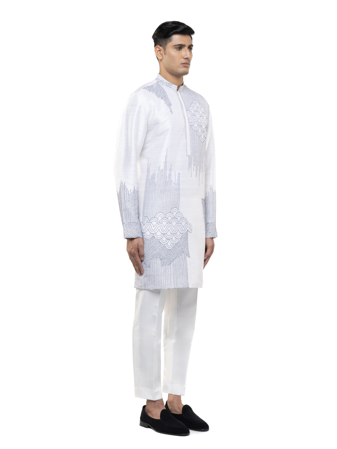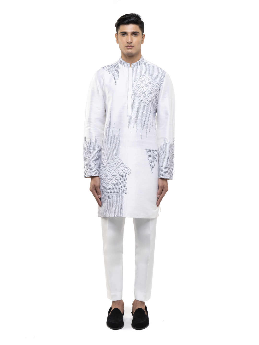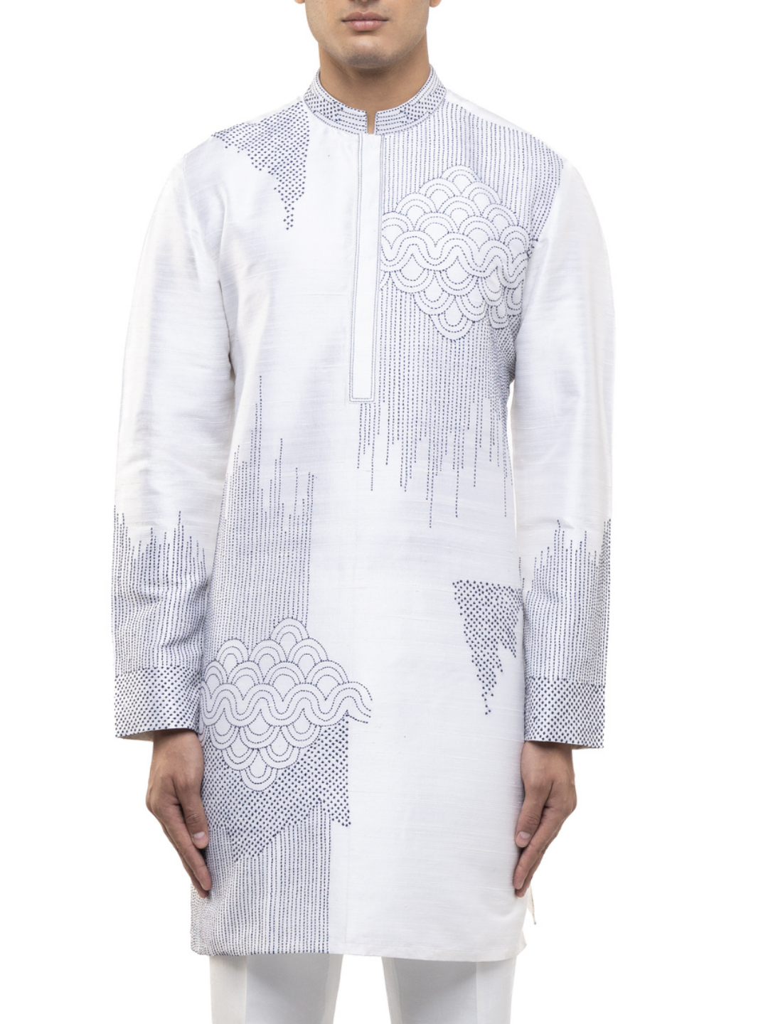 This White & Blue Thread Embroidered Kurta Set showcases delicate blue embroidery on smooth silk fabric, creating a fresh and elegant look. Designed with a stand collar, concealed placket, and Mother of Pearl buttons, it combines classic detailing with modern style. The straight hem and regular fit provide comfort and a sleek silhouette, perfect for festive occasions, formal events, or stylish daytime wear.