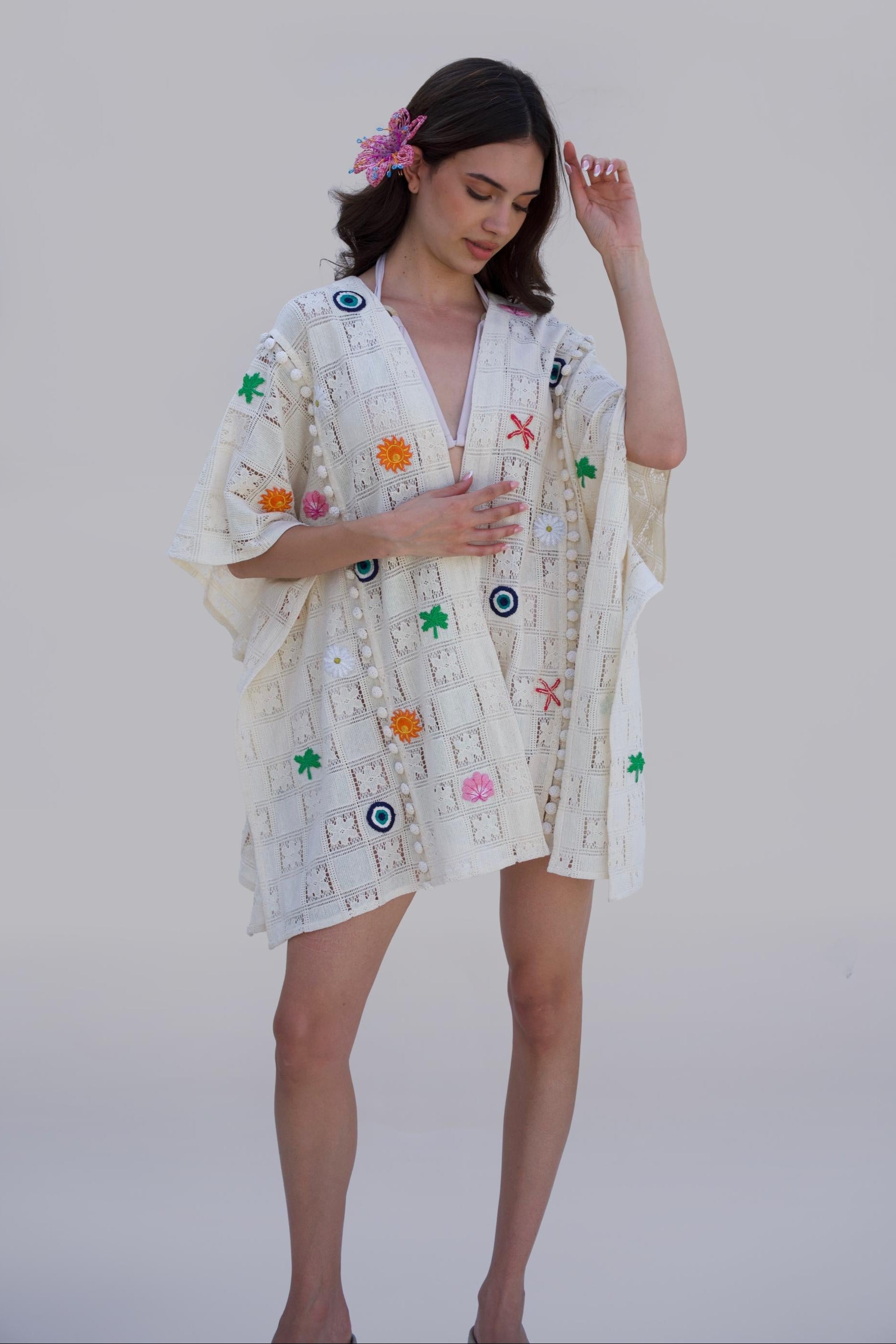 The White Bonnes Vacances Chella Kimono is the perfect layering piece for effortless summer elegance. Crafted from airy, breathable fabric, it features a relaxed silhouette with subtle detailing that adds a touch of sophistication. The soft white hue evokes a sense of calm and lightness, making it ideal for beach cover-ups, morning coffee runs, or lounging in style. Whether worn over a slip dress or paired with co-ords, it brings versatility and grace to your vacation wardrobe. Lightweight, easy to pack, and endlessly wearable—this kimono is a sunshine essential.