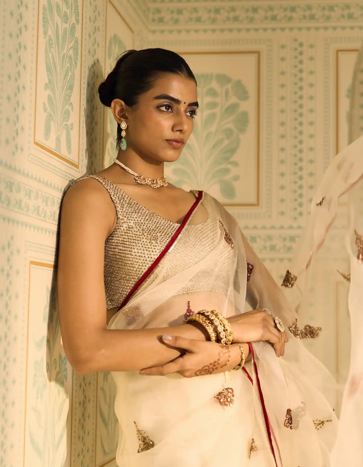 Elevate your elegance with the white chavi saree, crafted from exquisite organza silk that drapes beautifully. Its timeless white hue makes it perfect for weddings and festive occasions. The luxurious satin blouse piece adds a refined touch, ensuring a polished look. Make a stunning impression in this classic saree that embodies grace and sophistication.