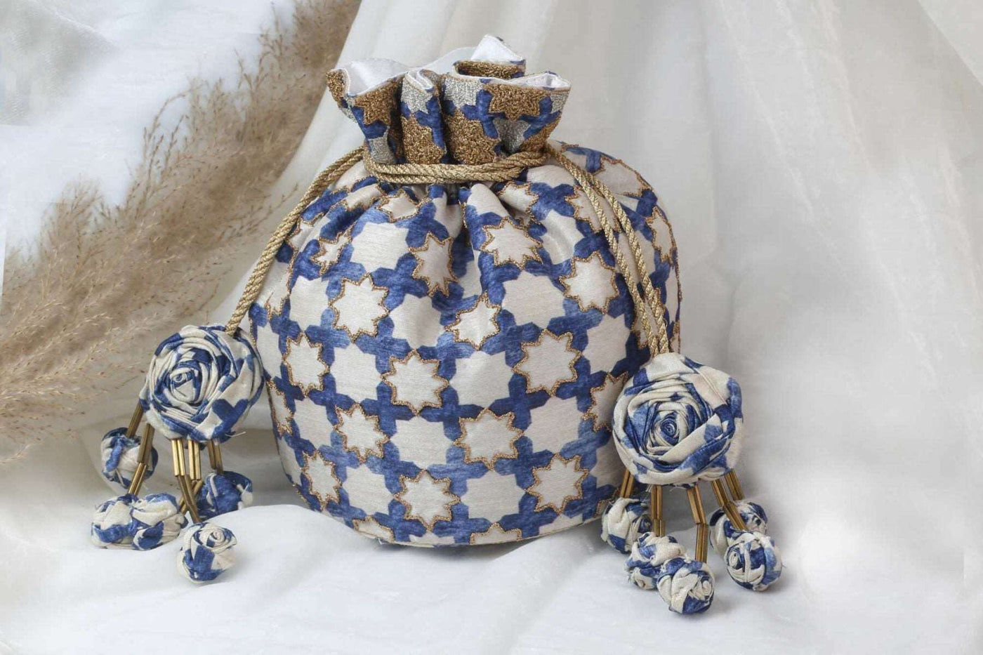 This timeless potli clutch features old-age classic Jaali work on a sophisticated cream base, exuding vintage charm. The intricate embroidery is highlighted with rich gold dori work, enhancing its luxurious appeal. The beautifully handcrafted flower tassels, a signature USP of the brand, add an elegant touch, making it perfect for weddings, festive celebrations, and special occasions.