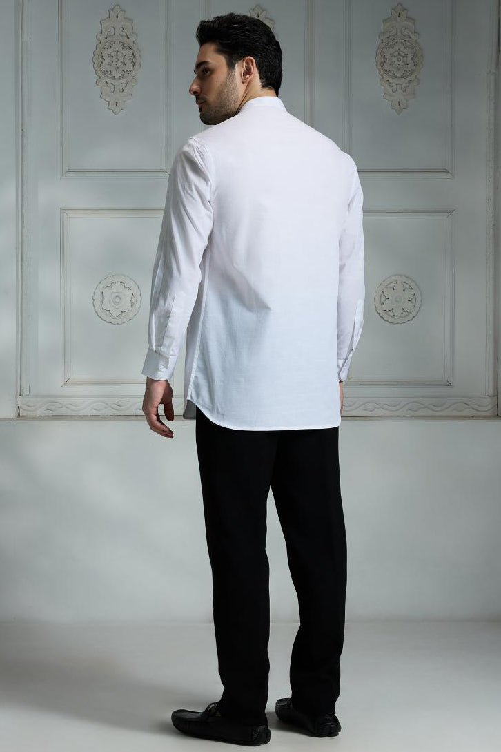This classic white shirt is crafted from soft, breathable cotton slub fabric for all-day comfort. It features a sleek mandarin collar, a four-button placket, and a functional chest pocket with button closure. The long sleeves add a refined touch, making it perfect for both formal and casual occasions. Pair it with tailored trousers for a clean, sophisticated look that never goes out of style.
