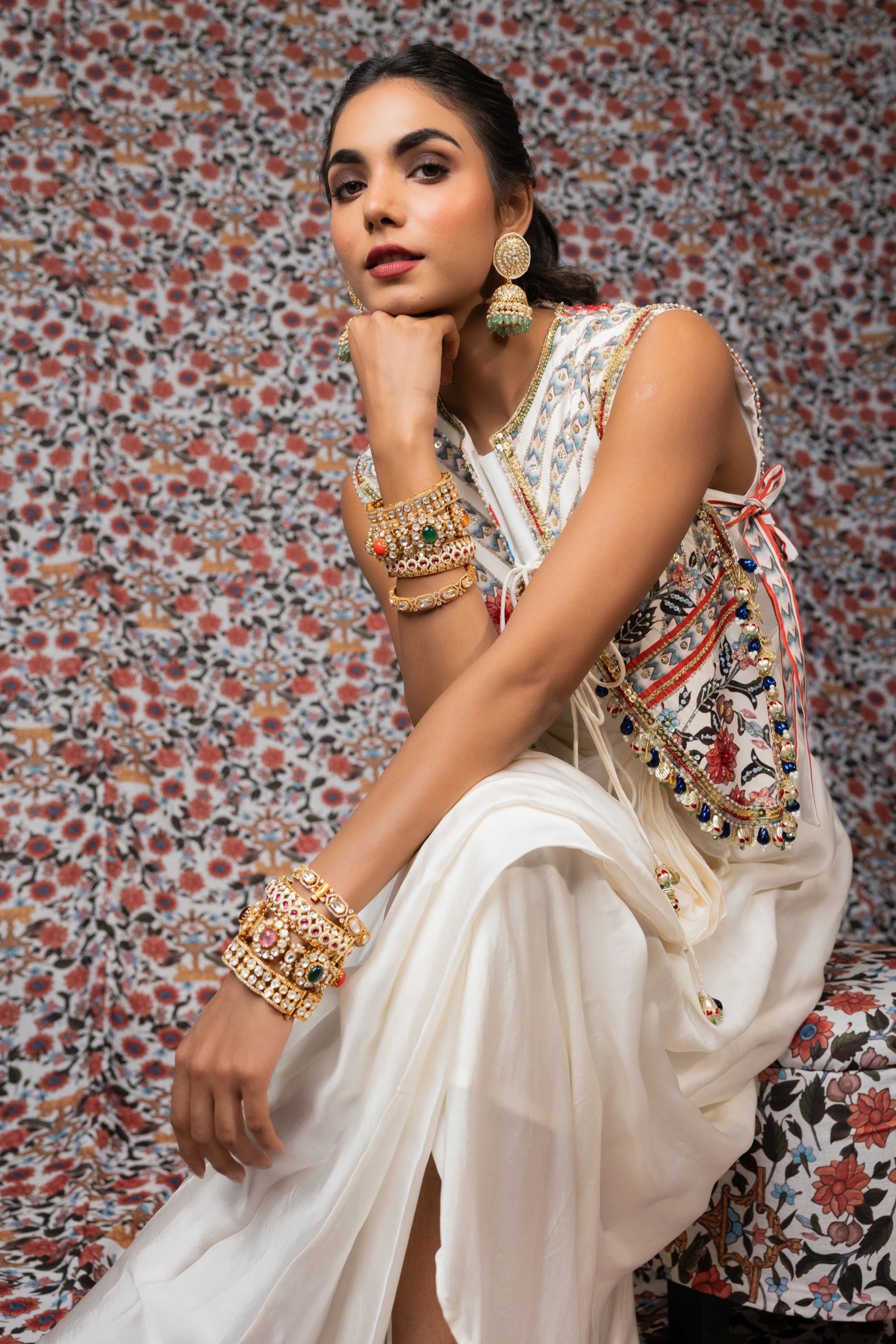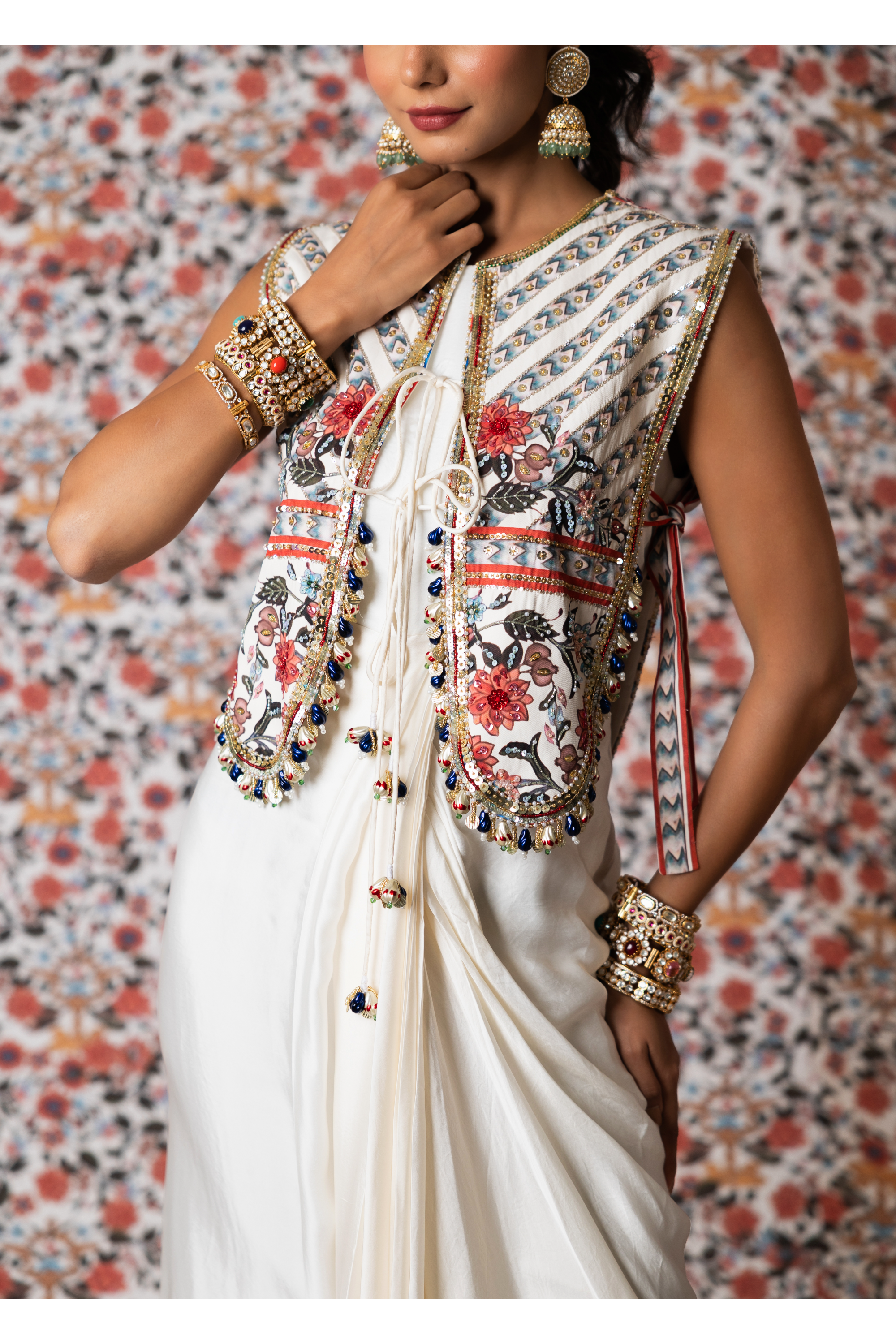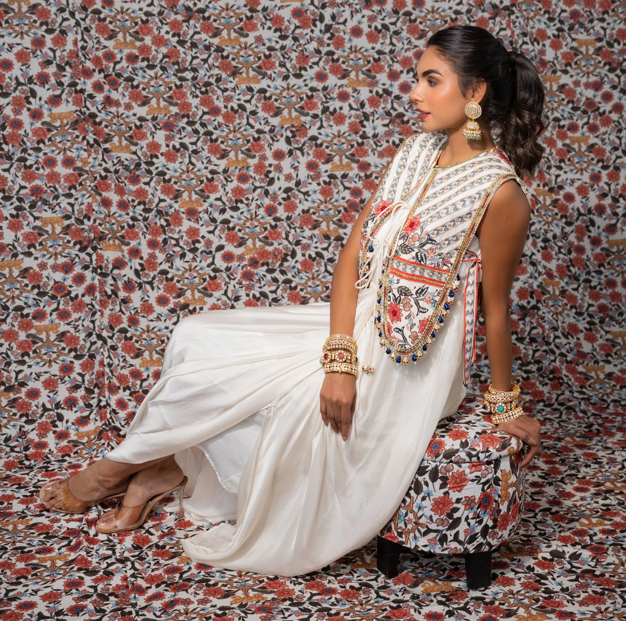 This white draped dress paired with a jacket offers the perfect blend of contemporary style and timeless elegance. The gracefully draped design of the dress creates a flattering silhouette, while the crisp white color adds a touch of sophistication. Paired with a sleek jacket, this ensemble exudes a modern yet classic appeal, making it ideal for both formal and semi-formal occasions such as evening parties, weddings, or upscale gatherings.