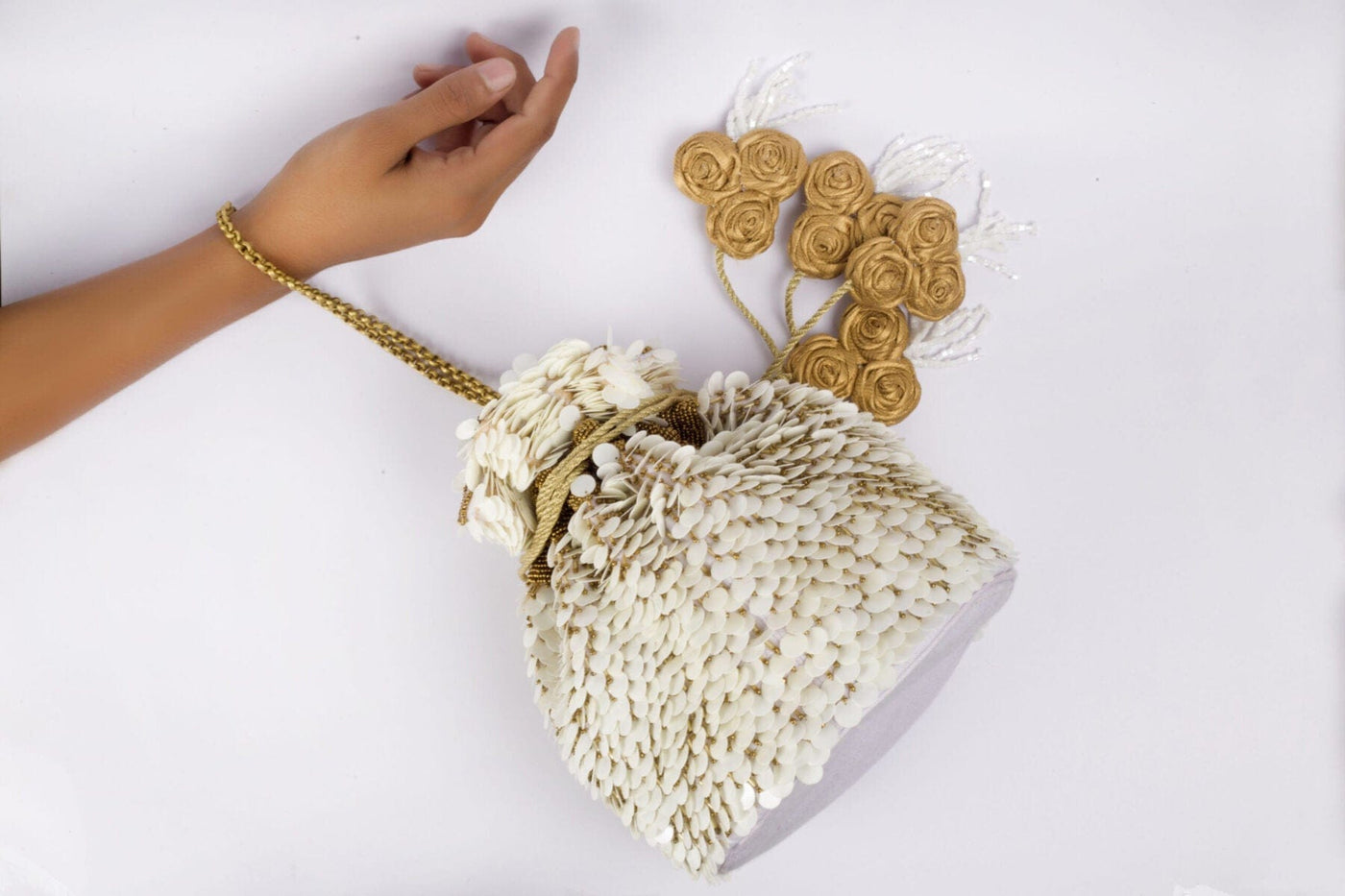 This exquisite potli clutch features a matte-finish white sequin design, carefully arranged to create a luxurious embossed effect. Adorned with intricate gold metal beadwork, it exudes elegance and sophistication. The beautifully handcrafted flower tassels, a signature USP of the brand, add a unique charm. Perfect for weddings, festive occasions, and grand celebrations.