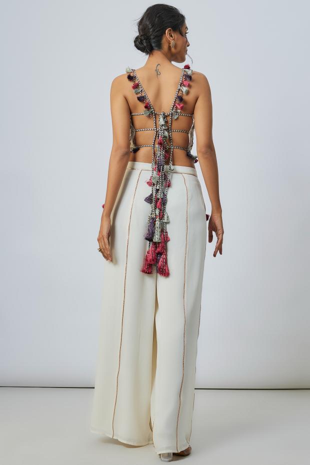 The White Embroidered Choli Sharara Set is a stunning fusion of tradition and elegance. The intricately embroidered choli, paired with the flowing sharara pants, brings a refreshing and sophisticated vibe to any festive occasion. The pristine white fabric exudes grace, while the fine embroidery adds a touch of opulence. Perfect for weddings or special celebrations, this ensemble embodies timeless beauty with a contemporary twist, ensuring you stand out in any crowd.