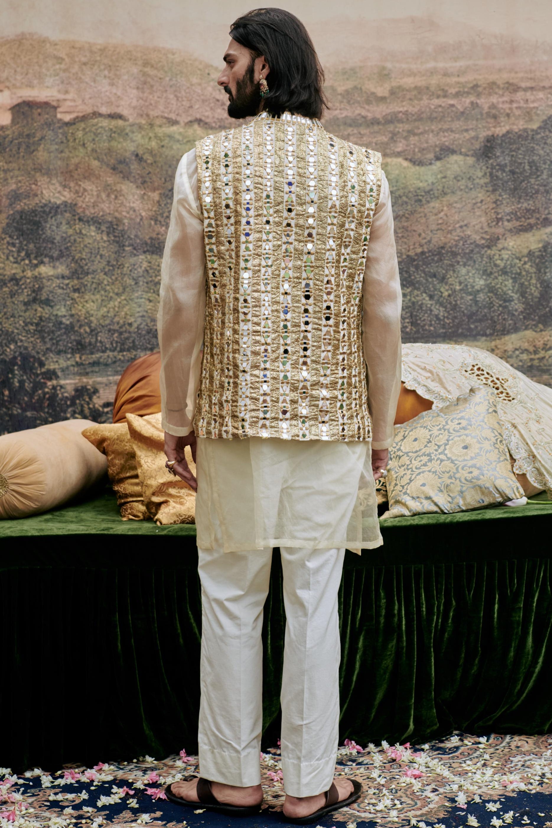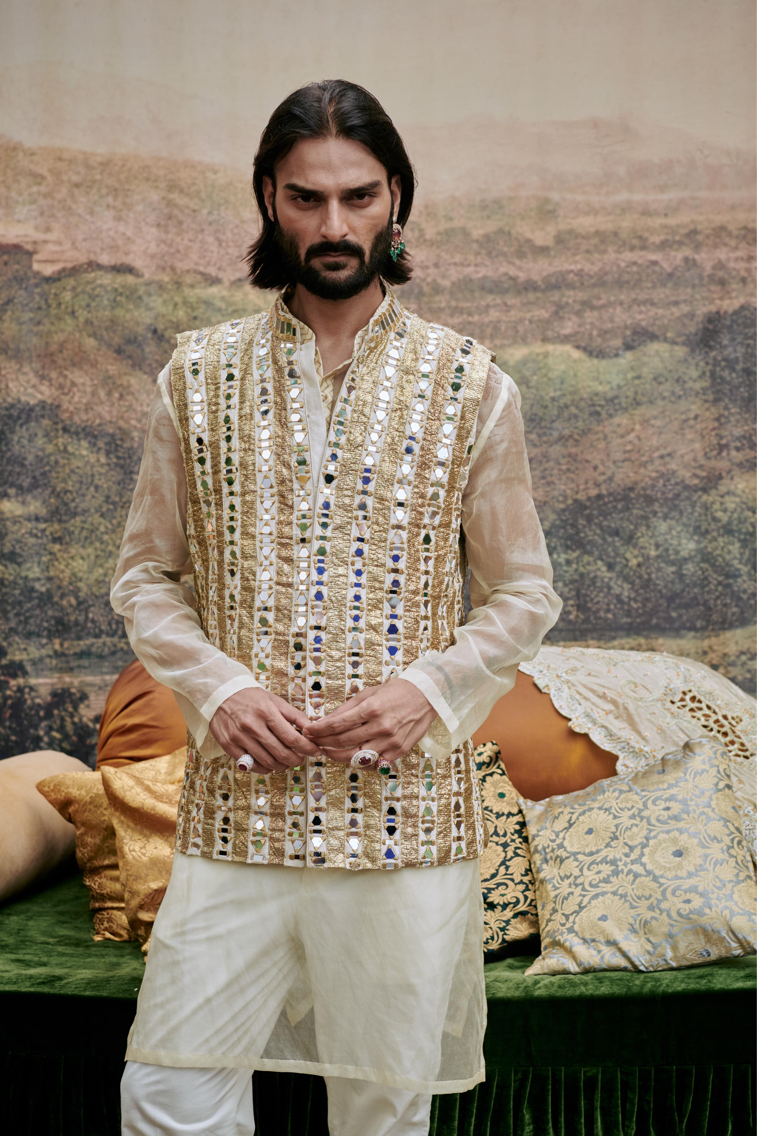 A stylish vertical mirror work bundi paired with a classic white kurta and pants creates a sophisticated and contemporary look, perfect for festive celebrations or formal events.